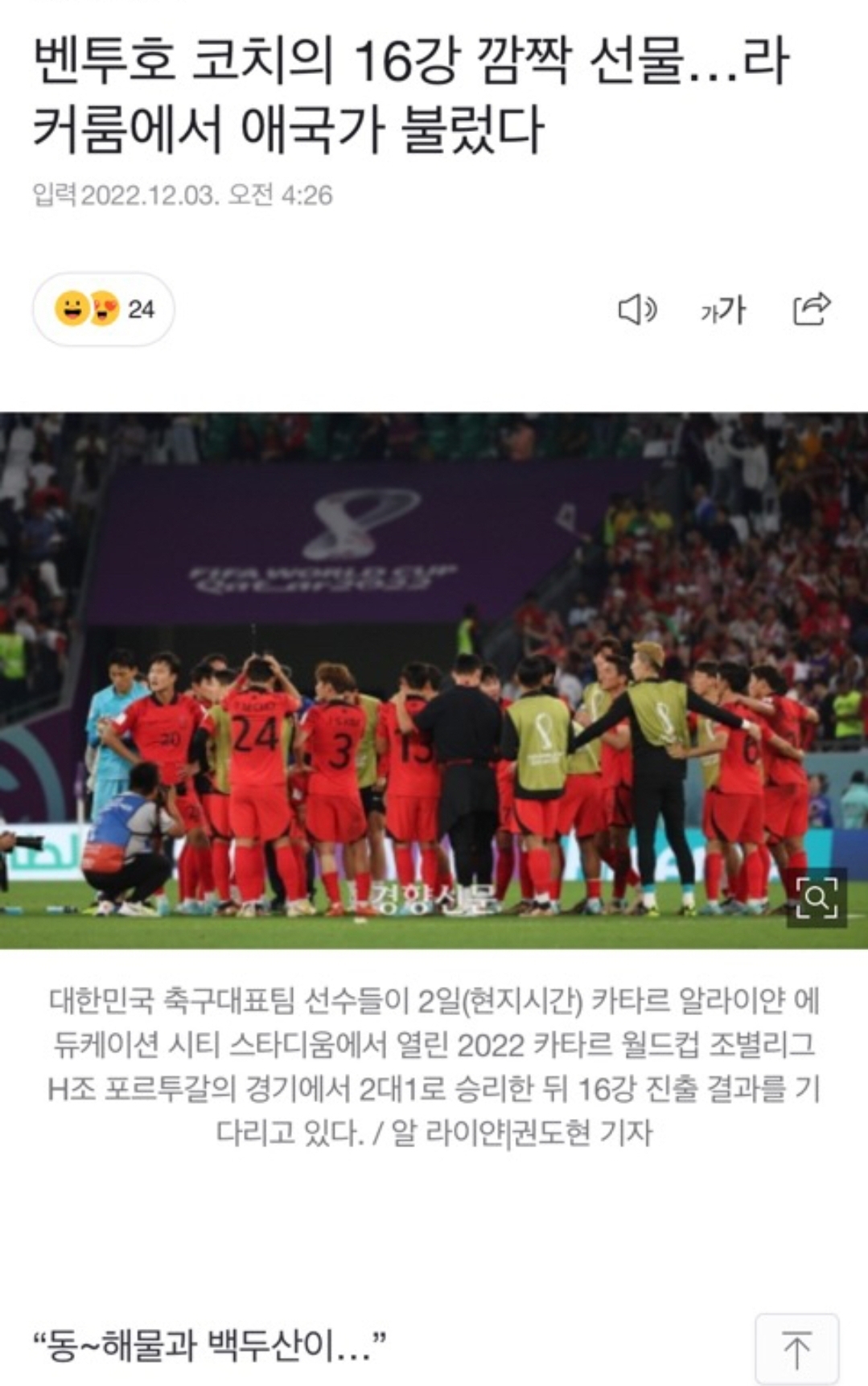 라커룸에 들어가니 외국인 코치가 애국가 불러줌