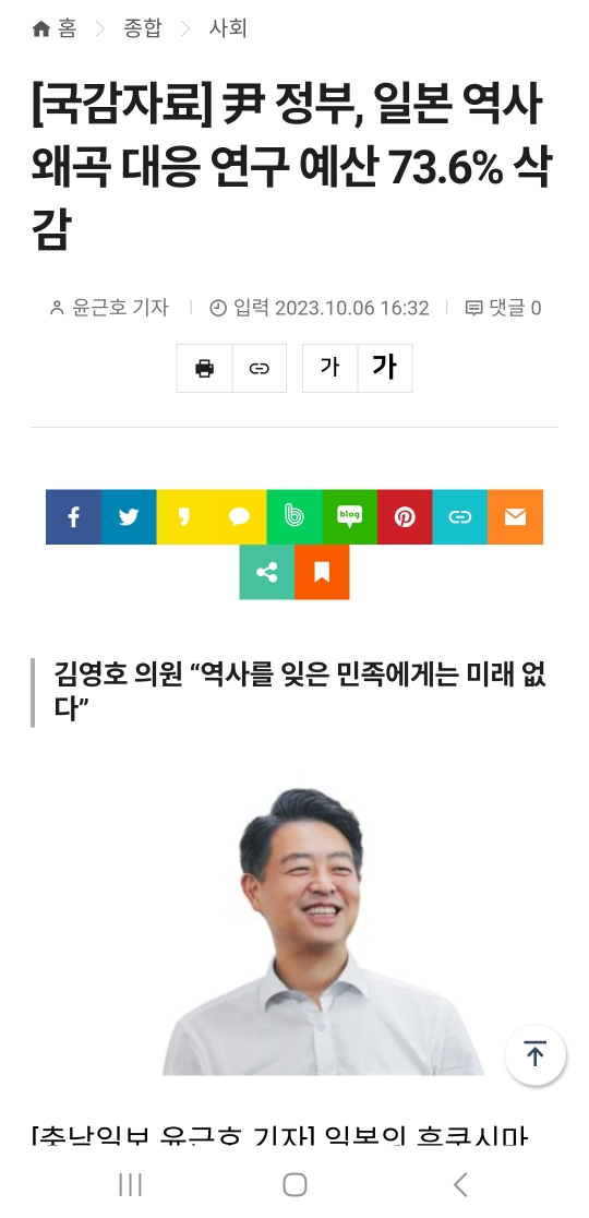 [여시뉴스데스크]尹 정부, 일본 역사왜곡 대응 연구 예산 73.6% 삭감 작성자허방재|작성시간23.10.06|조회수510 목록 댓글 5 글자크기 작게가 글자크기 크게가 출처 : http://www.chungnamilbo.co.kr/news/articleView.html?idxno=737467[국감자료] 尹 정부, 일본 역사왜곡 대응 연구 예산 73.6% 삭감 - 충남일보[충남일보 윤근호 기자] 일본의 후쿠시마 오염수 2차 방류가 시작된 가운데, 윤석열 정부의 ‘일본의 역사왜곡 대응 연구’사업 내년도 예산이 올해에 비해 70%가 넘게 삭감된 것으로 확인됐다.www.chungnamilbo.co.kr 다음검색 현재 게시글 추가 기능 열기 북마크 공유하기 신고 센터로 신고 댓글 댓글 5 댓글쓰기 답글쓰기 댓글 리스트 작성자뿡뿡이jake | 작성시간 23.10.06 생각보다 다양한 분야에 정부 예산이 들어갔었구나 알게됐고… 윤정부는 나라를 뿌리까지 잘라내는구나 잘알게됨 작성자코카콜라 마싯다 | 작성시간 23.10.06 투명하네 작성자국간장 | 작성시간 23.10.06 진짜 암담하다 작성자최정원 | 작성시간 23.10.06 매국노새끼 작성자원투소매치기포 | 작성시간 23.10.08 ㅅㅂ 매국노를 위에 앉혀놓으니 이꼴나지. 어떻게 이 중요한 소식이 뉴스 한번 안나와 댓글 전체보기