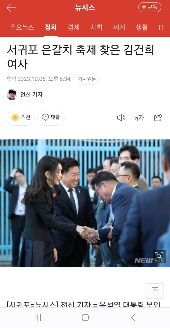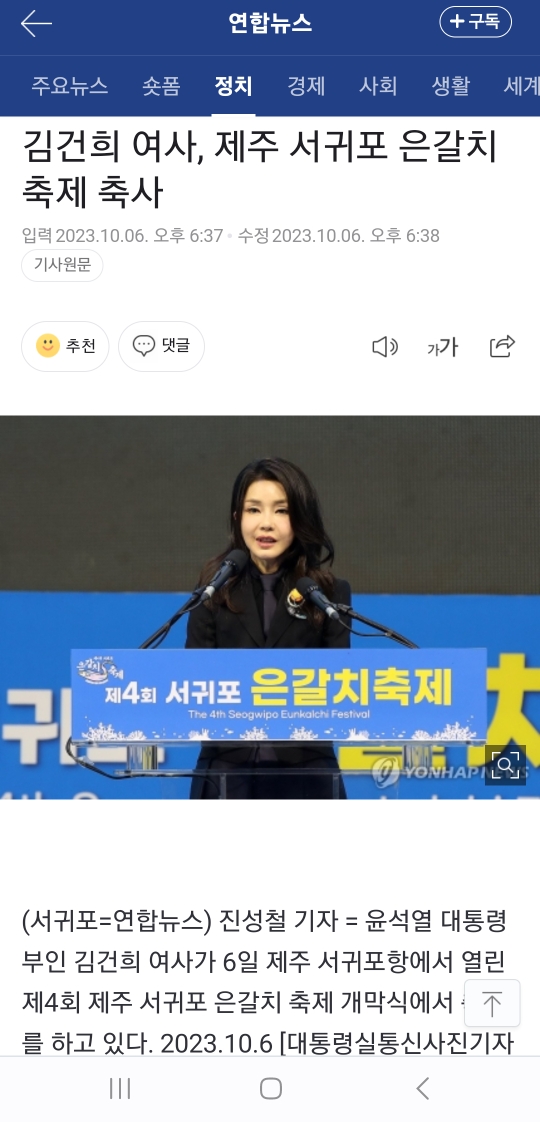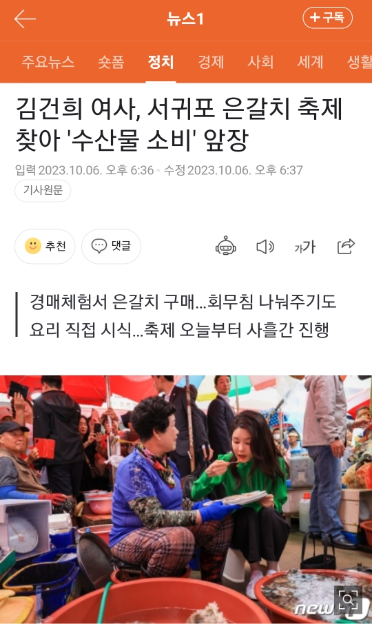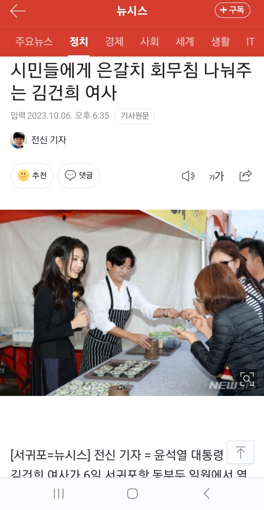 [여시뉴스데스크]김건희 여사, 서귀포 은갈치 축제 찾아 '수산물 소비' 앞장 작성자허방재|작성시간23.10.06|조회수1,284 목록 댓글 2 글자크기 작게가 글자크기 크게가 출처 : https://naver.me/FvFnKbln시민들에게 은갈치 회무침 나눠주는 김건희 여사윤석열 대통령 부인 김건희 여사가 6일 서귀포항 동부두 일원에서 열린 제4회 제주 서귀포 은갈치 축제에서 은갈치 회무침을 시민들에게 나눠주고 있다. 2023.10.06. photo1006@newsis.com 공감언론n.news.naver.comhttps://naver.me/5Acmn428김건희 여사, 서귀포 은갈치 축제 찾아 '수산물 소비' 앞장윤석열 대통령 부인 김건희 여사는 6일 은갈치 축제가 열리는 서귀포를 방문해 우리 수산물 소비 촉진에 나섰다. 김 여사는 이날 오후 지역 경제 활성화와 수산물 소비 확산을 독려하기 위해 제n.news.naver.com 다음검색 현재 게시글 추가 기능 열기 북마크 공유하기 신고 센터로 신고 댓글 댓글 2 댓글쓰기 답글쓰기 댓글 리스트 작성자오쩌쪼키이새 | 작성시간 23.10.06 축사를...? 작성자국민의 짐 | 작성시간 23.10.06 대가리 큰거봐 댓글 전체보기