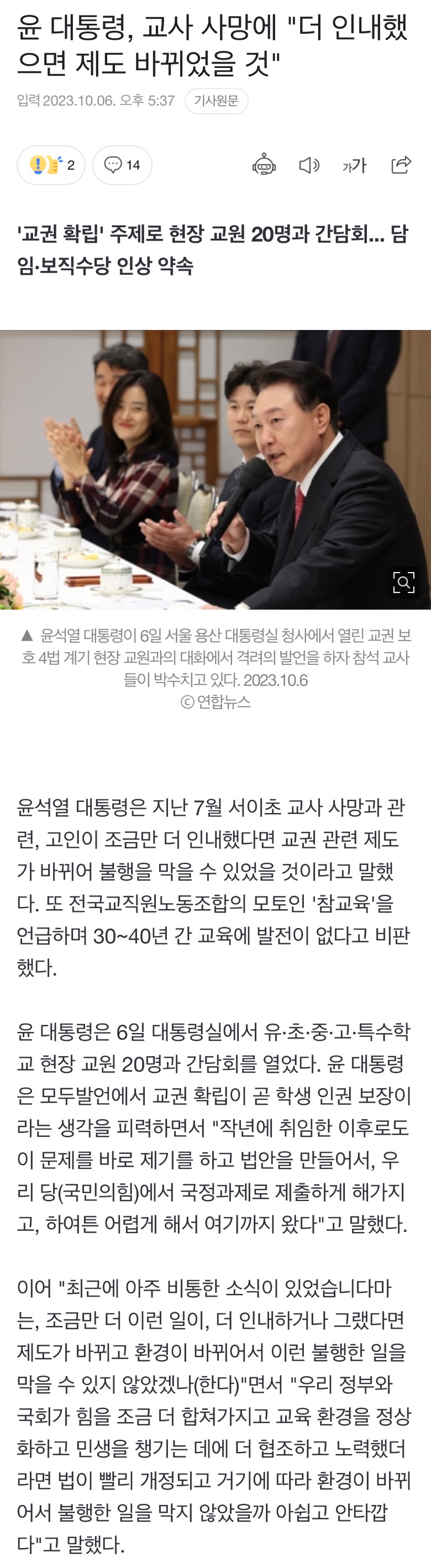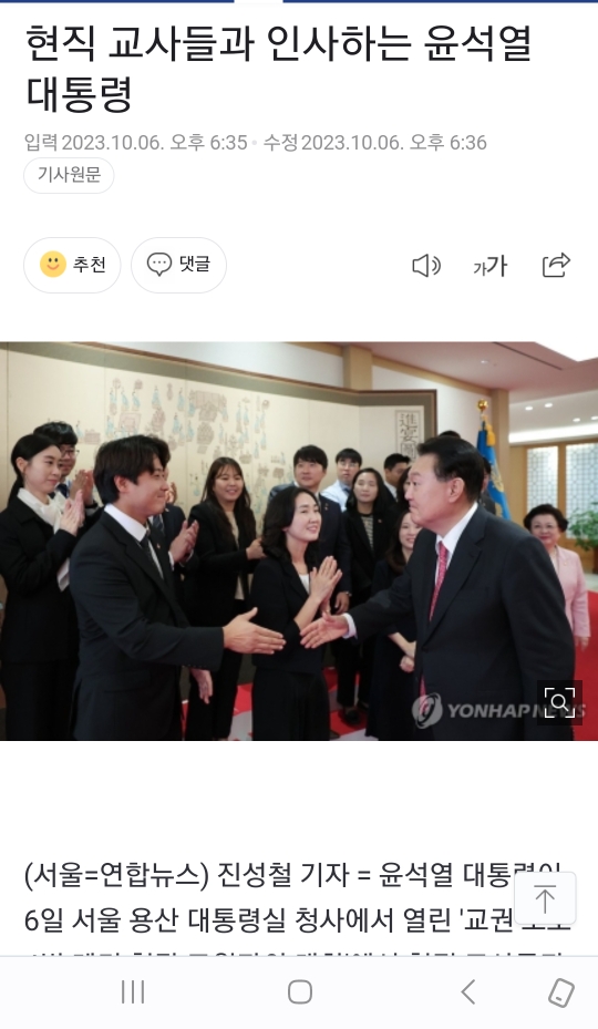 [여시뉴스데스크]교사들과 악수하는 윤 대통령 작성자허방재|작성시간23.10.06|조회수3,643 목록 댓글 16 글자크기 작게가 글자크기 크게가 출처 : https://naver.me/xWBN174T교사들과 악수하는 윤 대통령윤석열 대통령이 6일 서울 용산 대통령실 청사에서 열린 교권 보호 4법 계기 현장 교원과의 대화에서 교사들과 악수하고 있다. (사진=대통령실 제공) 2023.10.06. photo@newsis.com *재판매 및 Dn.news.naver.com 다음검색 현재 게시글 추가 기능 열기 북마크 공유하기 신고 센터로 신고 댓글 댓글 16 댓글쓰기 답글쓰기 댓글 리스트 작성자Tik Tak Tok(feat. So!YoON!) | 작성시간 23.10.06 인 내 ? 작성자미친세상아 | 작성시간 23.10.06 이게 뭔... 작성자맨드리고운고까옷 | 작성시간 23.10.06 나 지금 잘못 이해한줄 알고 3번 읽음.. 가슴이 답답하다 진짜 작성자짱귀여운다람쥐 | 작성시간 23.10.06 ???인내했으면?? 내가 이해한게 맞아 지금? 작성자개비해방일지 | 작성시간 23.10.06 소시오 아냐..? 댓글 전체보기