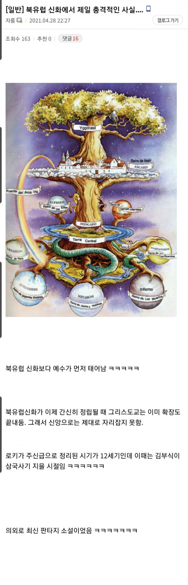 [스크랩] [흥미돋]북유럽 신화에서 제일 충격적인 사실 작성자minimute|작성시간23.10.07|조회수6,575 목록 댓글 4 글자크기 작게가 글자크기 크게가 출처 : 여성시대 피자빵먹음선덕여왕 : 로키야로키 : 네 누님 다음검색 스크랩 원문 : *여성시대* 차분한 20대들의 알흠다운 공간 현재 게시글 추가 기능 열기 북마크 공유하기 신고 센터로 신고 댓글 댓글 4 댓글쓰기 답글쓰기 댓글 리스트 작성자파란색안경 | 작성시간 23.10.07 아 단군이 오천년 전이라구요~! 작성자플래티넘pt | 작성시간 23.10.07 북유럽은 역사가 짧나? 바이킹은 자기들 신화가 없었나 작성자송어회 | 작성시간 23.10.07 엥 그냥 소설이노 작성자찰리 허냄 | 작성시간 23.10.07 토르야 해명해라 댓글 전체보기