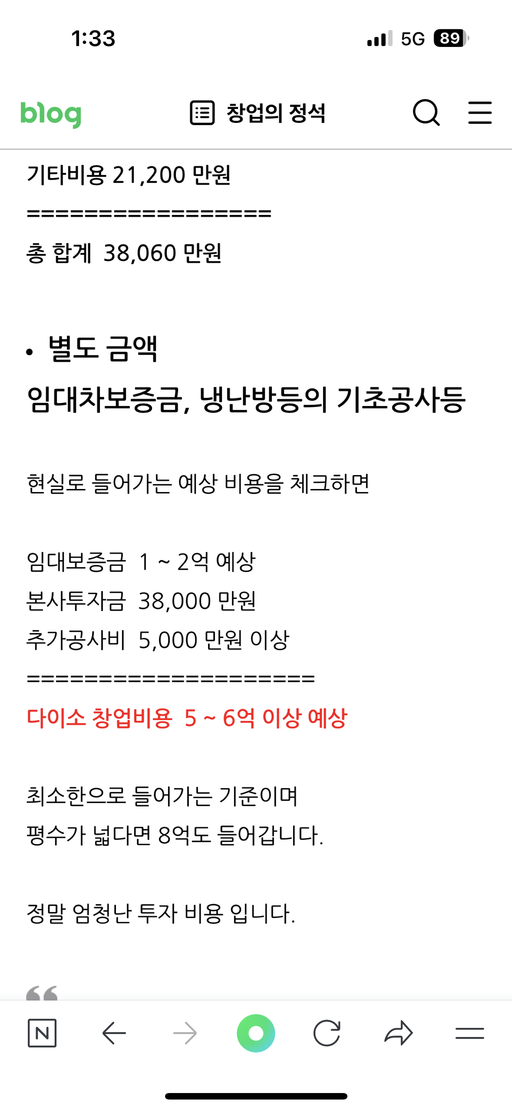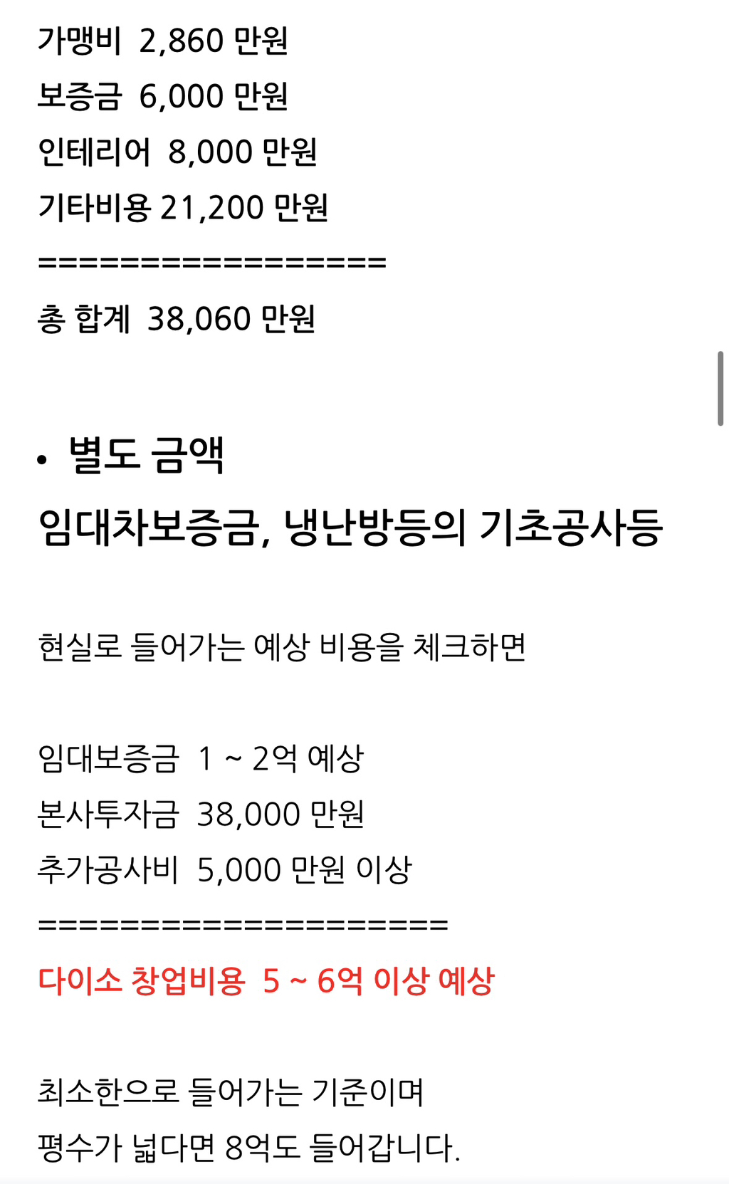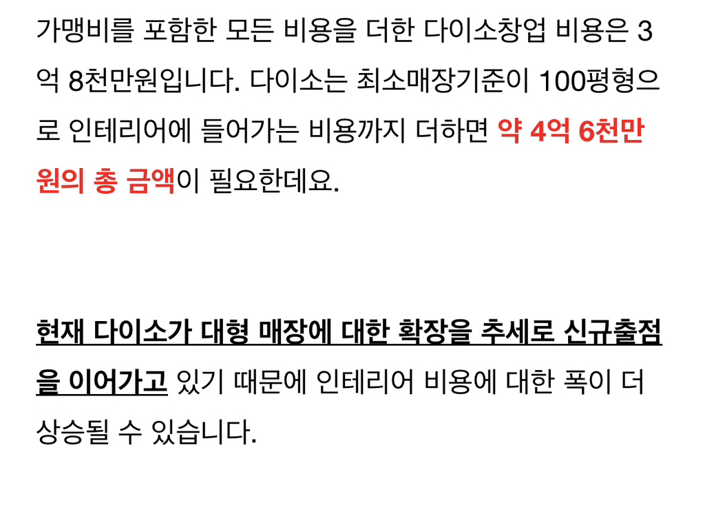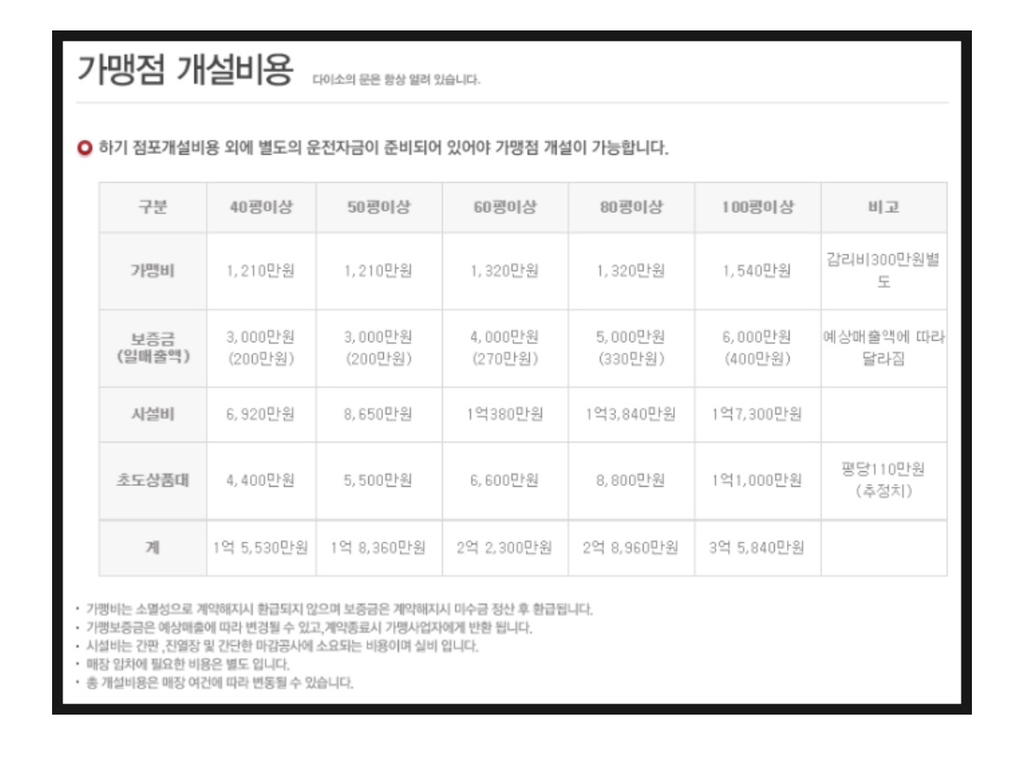 [흥미돋]다이소 창업 비용 작성자꽃잎같은 안녕|작성시간23.10.09|조회수198,500 목록 댓글 49 글자크기 작게가 글자크기 크게가 출처 : 여성시대 꽃잎같은 안녕우리동네 아파트 단지 엄청 많고대학교도 3개 있는데 다이소가 없어서내가 차려볼까 하고 심심해서 찾아봄차릴 돈도 없지만ㅋㅋㅋㅋㅋㅋㅋㅋㅋㅋㅋ다이소 기본 창업 조건은실평수 90~100평 이상의 점포를 가지고 있어야 한대본사에서 점포 추천 안해준대다이소 마진율은 28~30% 정도ㅎㅎ 심심해서 찾아봤는데 궁금증 해결 됐으니 더이상 안찾아볼래 ㅎㅎ 다음검색 현재 게시글 추가 기능 열기 북마크 공유하기 신고 센터로 신고 댓글 댓글 49 댓글쓰기 답글쓰기 댓글 리스트 작성자그래도잔망 | 작성시간 23.10.10 그럼 상가 투자는 돈 많은 사람들이 하는건가 작성자이주동안 | 작성시간 23.10.18 카페보다 나은듯 작성자서글픈고양이 | 작성시간 23.10.19 ㅎ...ㄱ... 작성자해피니스 정이현 | 작성시간 23.10.19 일 그만두고 해볼까 싶었는데지금 내수준에 대출받아서 차리긴 글렀네... ㅠㅠ 작성자akqoㅁ | 작성시간 23.10.20 건대 다이소 개작음 댓글 전체보기