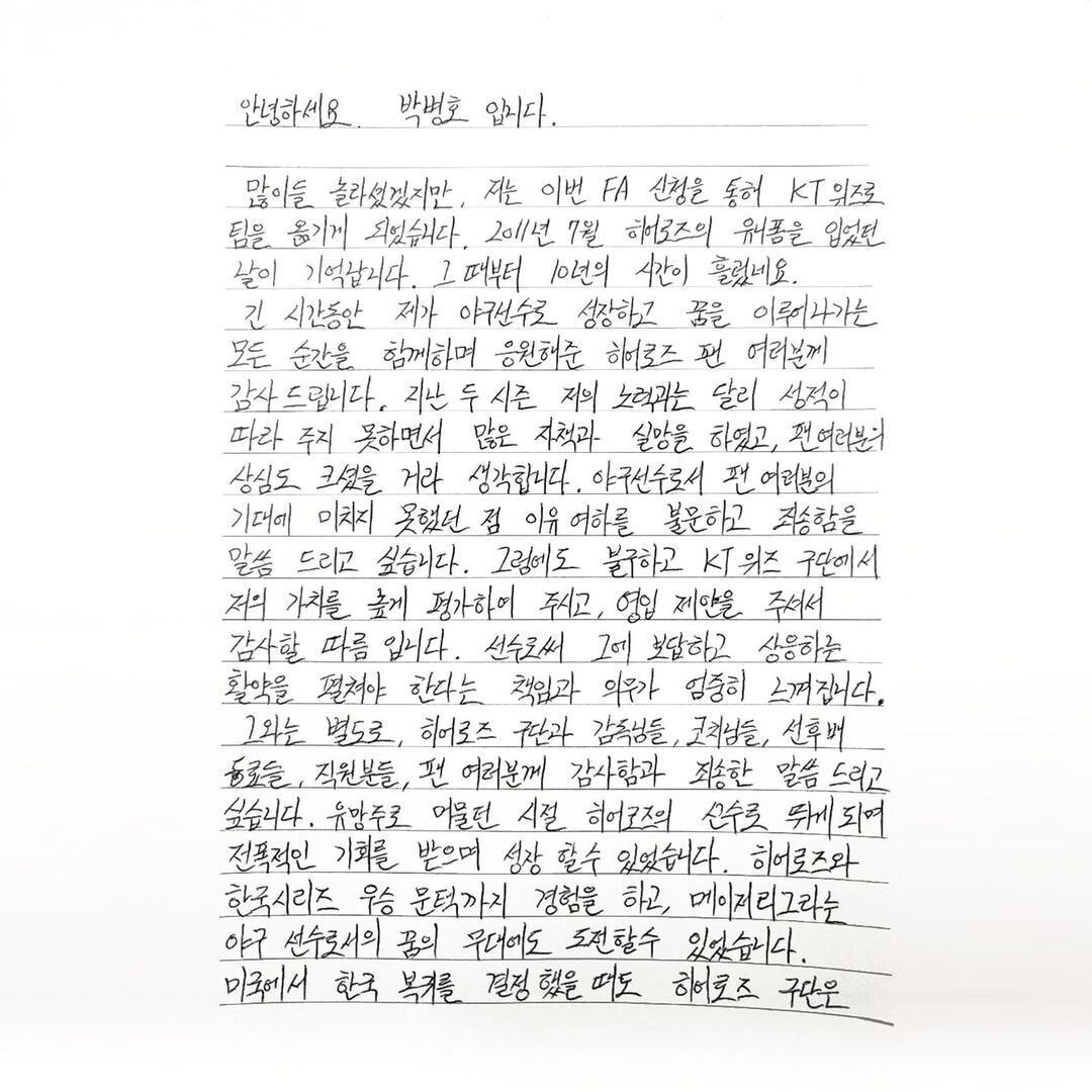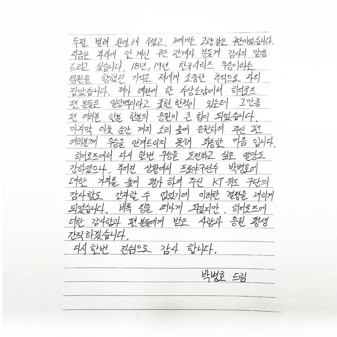 "팬들의 열정적인 응원이 있어서 지금의 박병호가 있다고 생각합니다. 팬들께서 조금의 상실감은 있으시겠지만, 예전처럼 힘껏 응원해주셨으면 좋겠습니다."