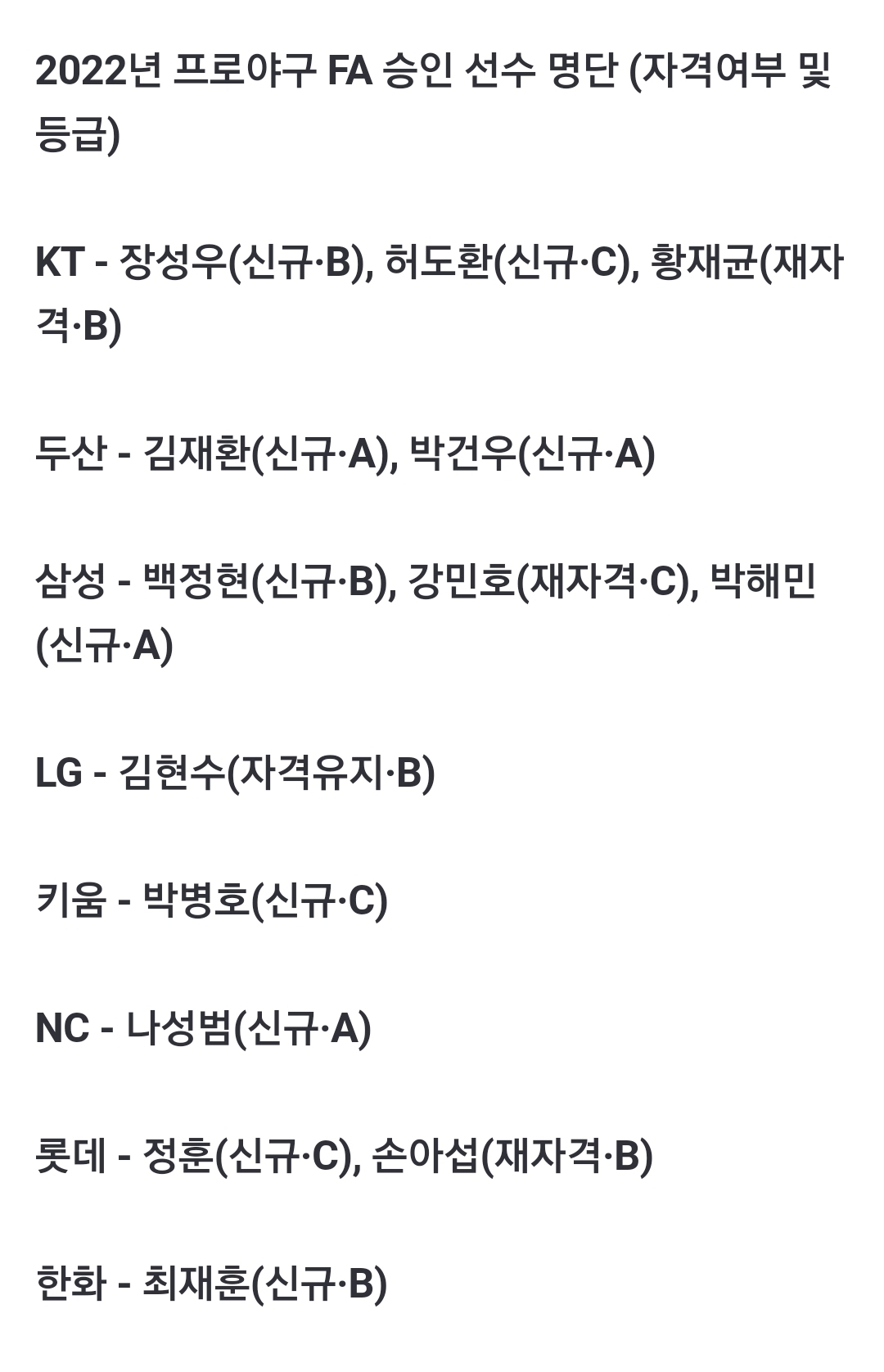 FA란? 프로 1군에서 대략 9시즌을 출장한 선수가 자유롭게 팀을 이적할 수 있는 자유계약권리를 취득하는 것.