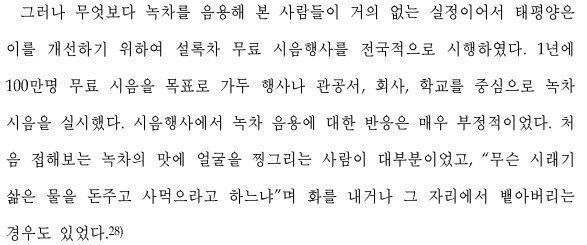 작성자tarte vanille 작성시간 23.10.15 우리 민족 입맛에 가장 잘 맞고 익숙해보이는 건 숭늉 아니면 숭늉과 유사한 무언가...인가보더라 조선시대까지 다들 밭일 열심히 하고 새참 한가득 먹은 다음에 숭늉으로 입가심하는 패턴이 정착되어있었어서... 개인적으로 녹차 좋아해서 시음회때 환영 못 받았다는 건 괜히 섭섭하지만 ㅋㅋㅋ 현대에 와서 우리들이 맨날 아메리카노를 달고 사는 이유가 숭늉과 얼추 비슷해서라는 추측을 들었는데 그게 참 재밌었어