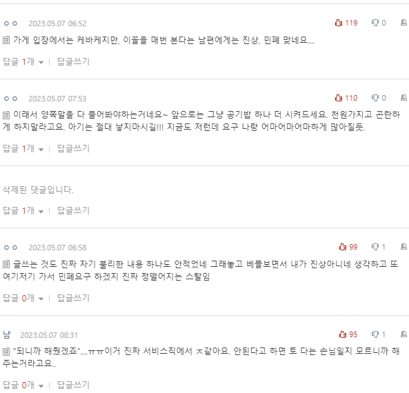 작성자북실헴 작성시간 23.10.23 다른 걸 다 떠나서 남편이 이 가게에서만큼은 그러지 말아 달라고 했는데 한 것부터가•••