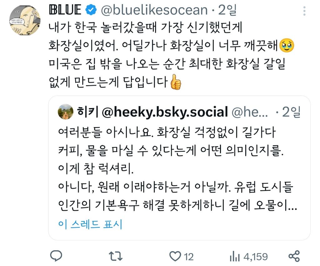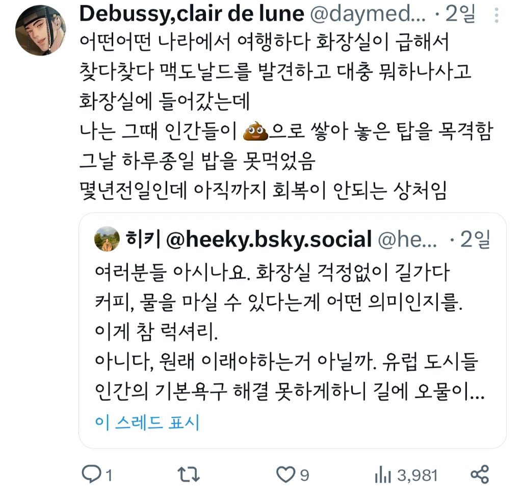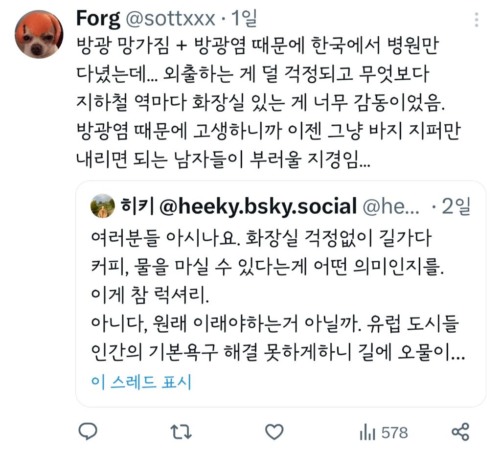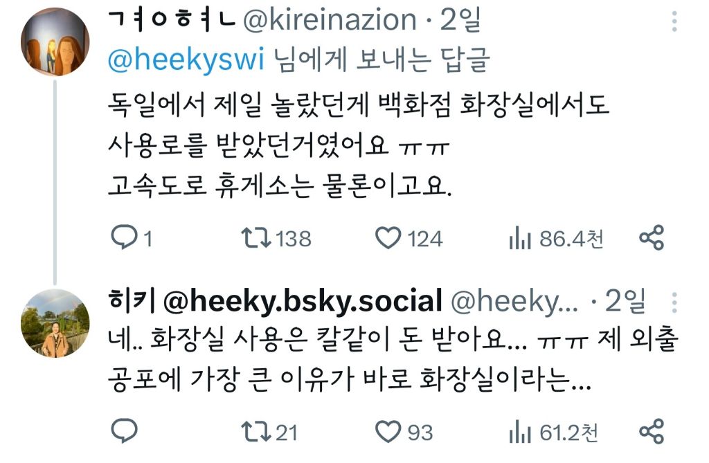 작성자뚜두두du 작성시간 23.10.24 ㄹㅇ이야.. 외국에서돈내고화장실써야하고 쓰기가어려움 ㅡㅡ