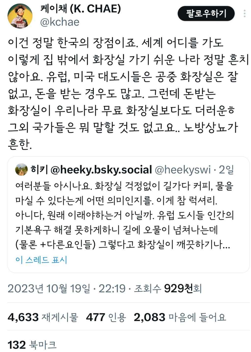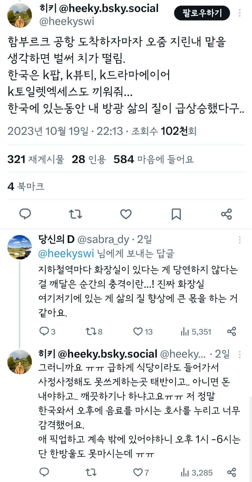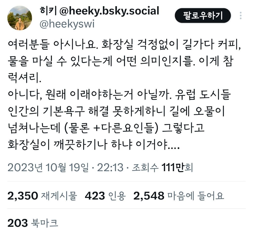 작성자뚜두두du 작성시간 23.10.24 ㄹㅇ이야.. 외국에서돈내고화장실써야하고 쓰기가어려움 ㅡㅡ