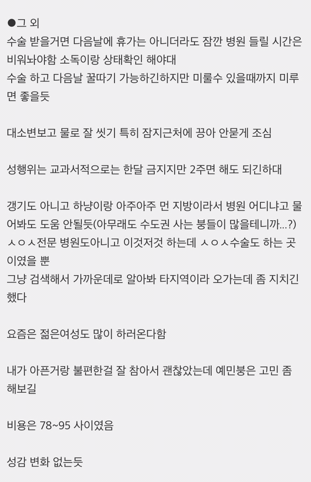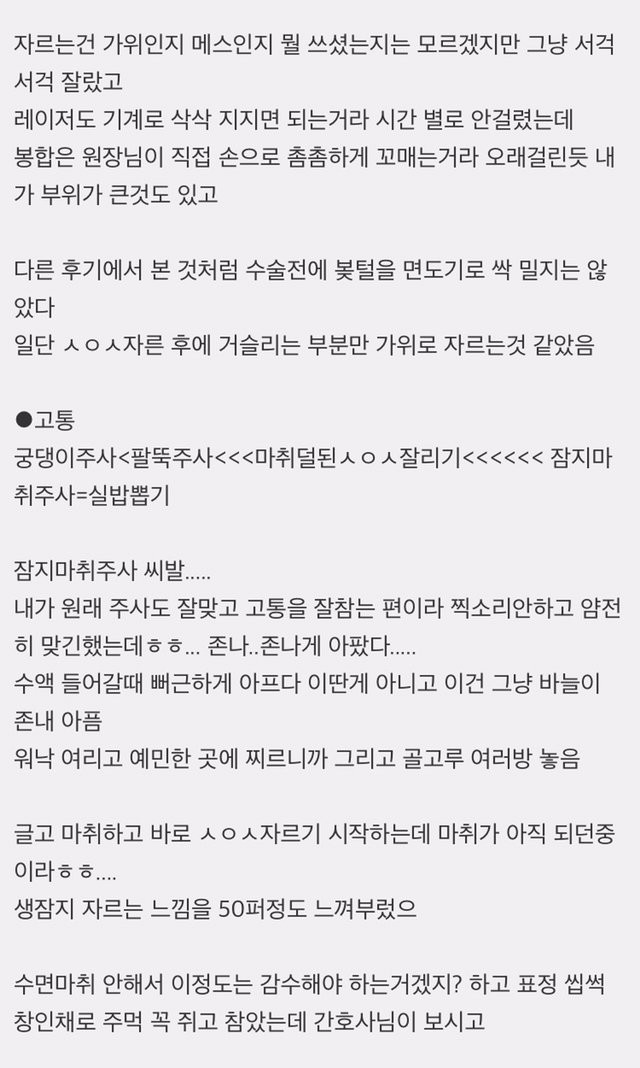 작성자바닐라 라테이 작성시간 23.10.22 나 몇년전에 했었는데 진짜 잘한 일 중 하나임 수면마취로해서 별로 아프지도 않았고 그냥 수술후에 관리해줘야해서 일주일 불편한 거 빼고는 힘든 것도 없었음 수술하고 광명찾았다