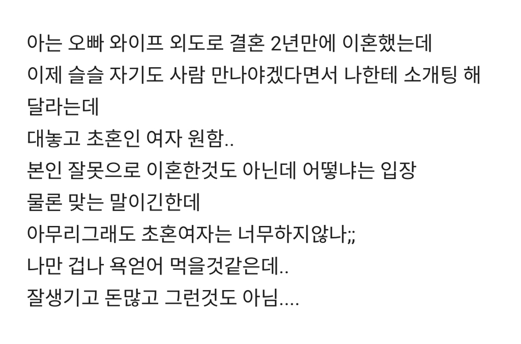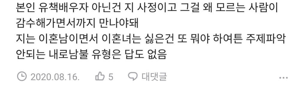 [칵.cxxxx]이혼했으면서 초혼 여자 찾는 주제파악 안된 돌싱남 작성자의사여시|작성시간23.10.22|조회수13,880 목록 댓글 14 글자크기 작게가 글자크기 크게가 출처 : 여성시대 의사여시https://www.teamblind.com/kr/post/%EC%9D%B4%ED%98%BC%ED%96%88%EC%9C%BC%EB%A9%B4%EC%84%9C-%EC%B4%88%ED%98%BC-%EC%97%AC%EC%9E%90-%EC%B0%BE%EB%8A%94-%EC%95%84%EB%8A%94%EC%98%A4%EB%B9%A0-feACihvq결혼생활: 이혼했으면서 초혼 여자 찾는 아는오빠...아는 오빠 와이프 외도로 결혼 2년만에 이혼했는데이제 슬슬 자기도 사람 만나야겠다면서 나한테 소개팅 해달라는데 대놓고 초혼인 여자 원함..본인 잘못으로 이혼한것도 아닌데 어떻냐는 입장www.teamblind.com근데 돈많고 잘생겨도 돌싱이 어딜 초혼에다 비빔..?그리고 지보다 연상일지라도 누가 지따위를 거들떠본다고…? 좋은말로할때 돌싱은 돌싱끼리 만나라; ㄹㅇ 기가차서 퍼옴 다음검색 현재 게시글 추가 기능 열기 북마크 공유하기 신고 센터로 신고 댓글 댓글 14 댓글쓰기 답글쓰기 댓글 리스트 작성자잇프제그잡채 | 작성시간 23.10.22 외도 왜 했는지 이해된다ㅋㅋㅋ 작성자행복해피니스 | 작성시간 23.10.22 한남들은 왜 이렇게 자아가 비대할까 작성자이영지농협은행 | 작성시간 23.10.22 이정도면 유전자 내 프로그래밍 문제 작성자ESTP일것같은INTP | 작성시간 23.10.22 초혼인 여성 만날거면 8살이상 연상녀 ok해도 될까말까인데 어디 동생친구 소개받을 생각을,, 작성자세인트 엑소시스트 | 작성시간 23.10.22 고추작은거 비교될까봐? 댓글 전체보기