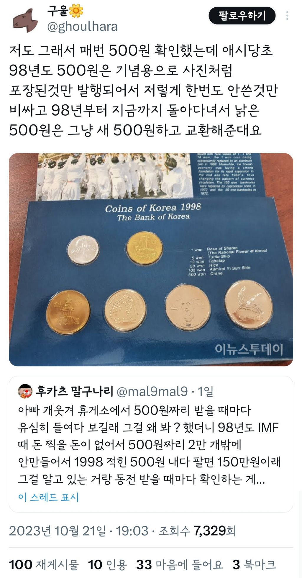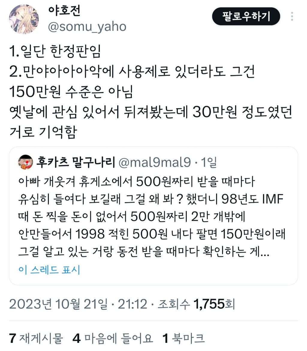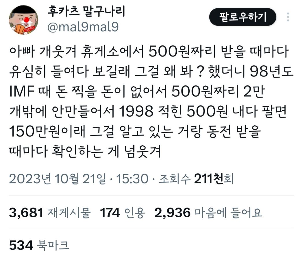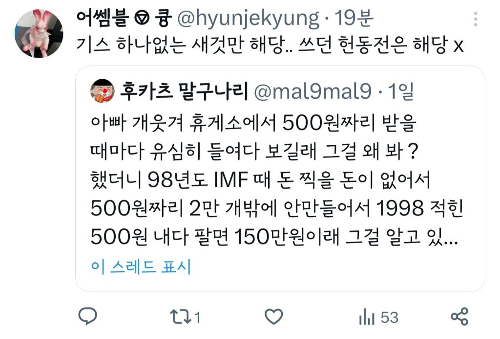 작성자azrue 작성시간 23.10.24 우리아빠도 이러시는데ㅋㅋㅠ차마 말해 줄 수 없어서 몇달에 한번씩 10원 50원 100원 500원 모아온거 다 정리할때마다 이거 얼마냐고 검색해보라고하는데 말못하겠어서 걍 검색하고 으악 아깝다!! 다음 로또동전 찾어! 이러고 놈ㅋㅋ