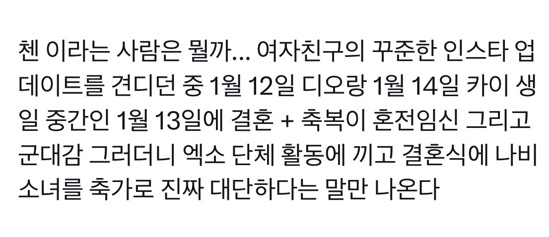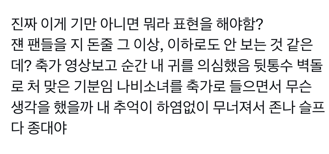 마지막 트위터 영상 보면 멤버 입으로 >자기들이랑 팬을 이어주는 노래< 라고 함 ㅇㅇ... 아무튼 그래서 첸씨는 트위터에서 열심히 욕 먹는 중