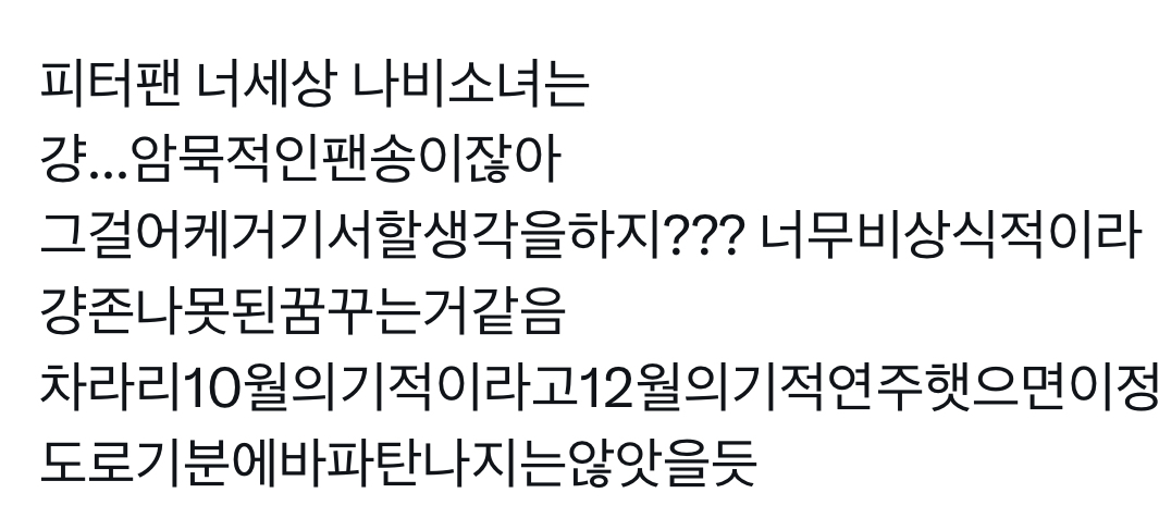 피터팬, 나비소녀, 너의 세상으로 이 세곡은 특히나 엑소팬들에게 의미있는 노래임. ‘나비소녀’는 팬송 버금가게 팬들에게 소중한 노래. 다른 노래도 아니고 팬들 기만한
