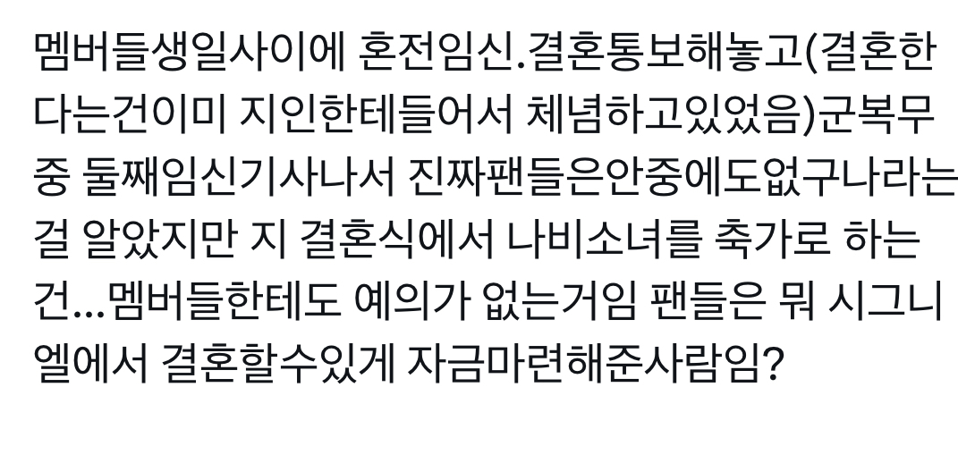 장본인이 본인 결혼식에서 팬들에게 의미있는 노래를 사용해서 논란이 커짐.