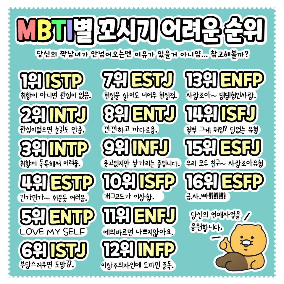 [흥미돋]MBTI별 꼬시기 어려운 순위.jpg 작성자믹키유천|작성시간23.10.23|조회수15,470 목록 댓글 42 글자크기 작게가 글자크기 크게가 출처 : 여성시대 (믹키유천)락싸펌MBTI별 꼬시기 어려운 순위.jpgㅋㅋㅋㅋㅋ락싸 이거가져다 분석하고있노 다음검색 현재 게시글 추가 기능 열기 북마크 공유하기 신고 센터로 신고 댓글 댓글 42 댓글쓰기 답글쓰기 댓글 리스트 작성자뿔버섯. | 작성시간 23.10.24 내 까다로운 취향에 맞춰 구겨져 들어와보걸아 작성자알려줘요생생정보 | 작성시간 23.10.24 사람좋아댕댕이어도 남잔달라ㅋㅋ웃고노는게좋은거라서 그와중에 인성보고 손절침 작성자비나리야 | 작성시간 23.10.24 엔티제가 저 순위인건 말도 안 됨 ㅋㅋ 얼마나 철벽인데 작성자윤마리 | 작성시간 23.10.24 엣프피 꼴찌노.. 작성자선릉역매운떡볶이 | 작성시간 23.10.24 16등.. 금사빠 맞아요 ㅋㅋㅋㅋㅋㅋㅋㅋㅋㅋㅋㅋㅋㅋ 댓글 전체보기