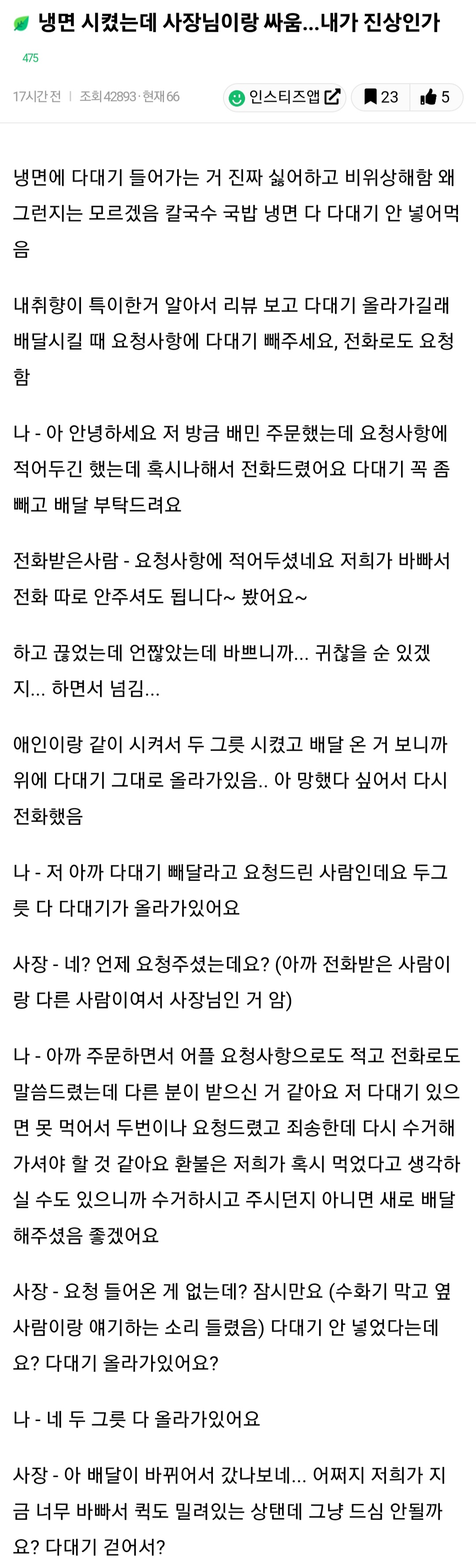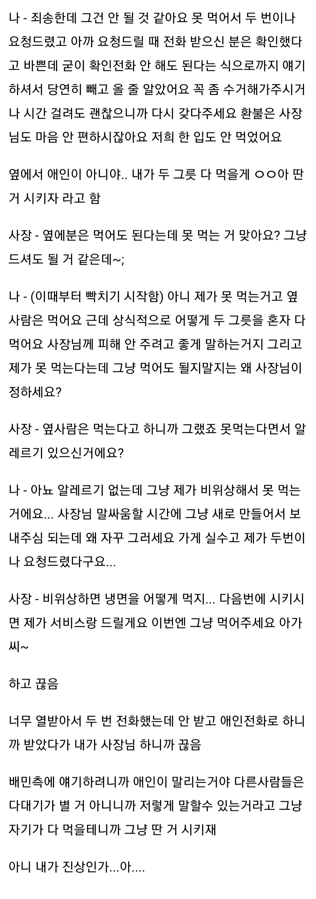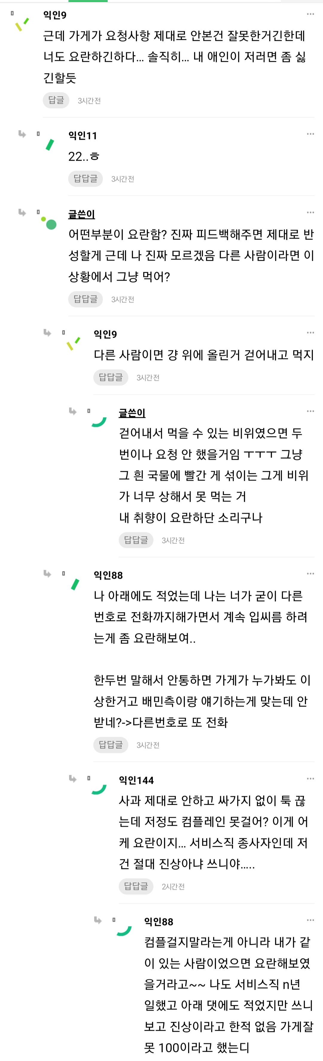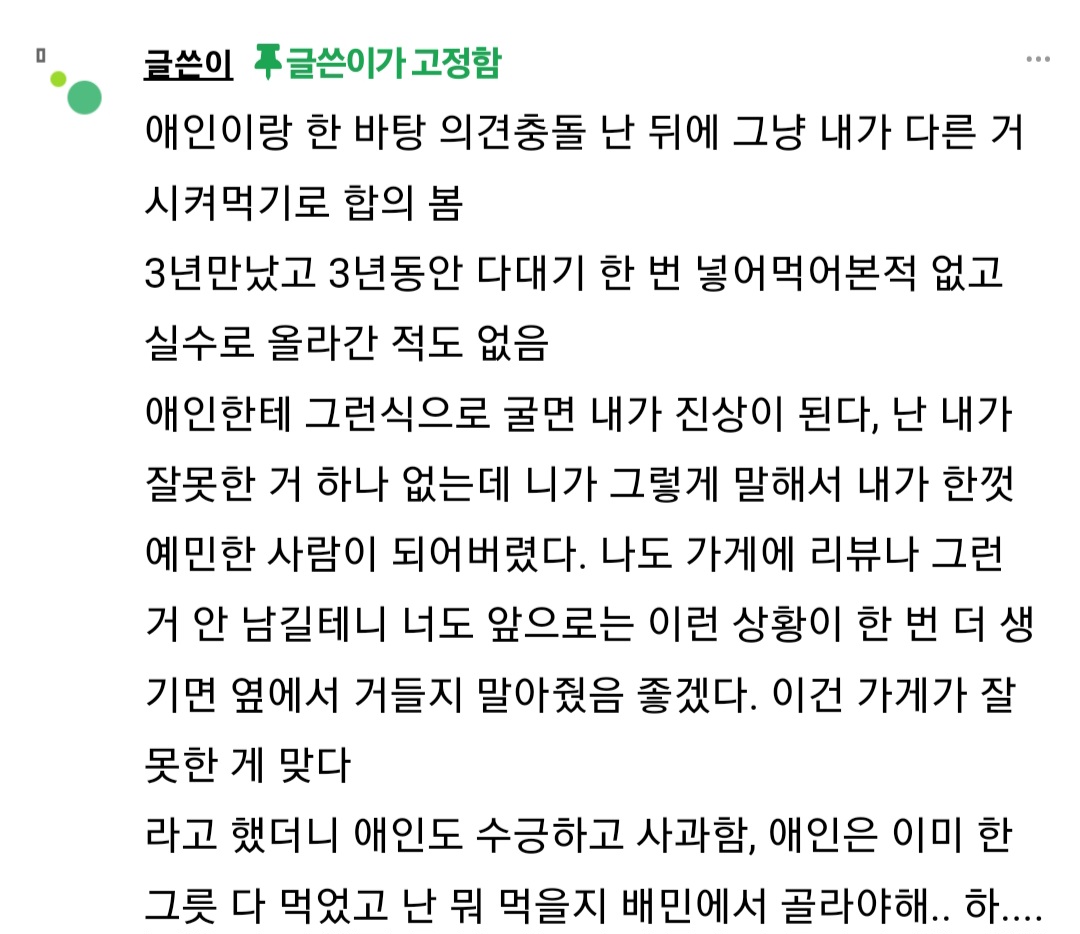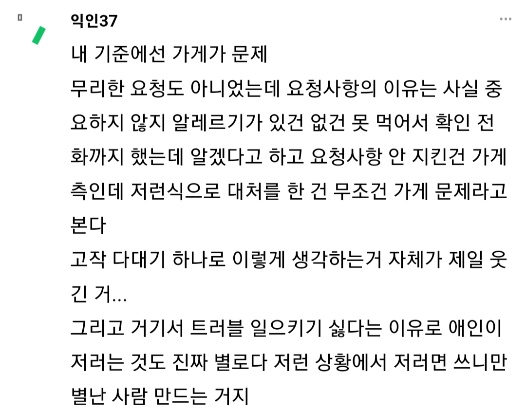 작성자정말국악무도회 작성시간 24.02.15 글쓴이가 뭐가 유난이야 제발 취향존중좀ㅠ 가게에서 처음부터 안된다고 했으면 안시켰겠지;