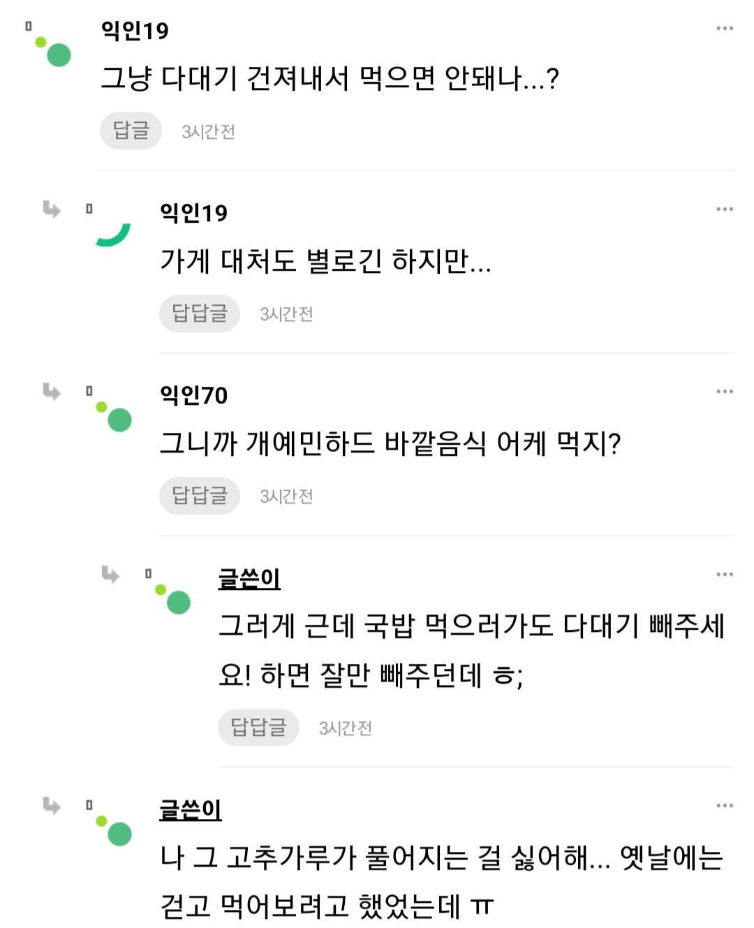 근데 글쓴이도 유난이라 지인으로 안두고싶음 .. 다른 메뉴를 먹던가..
