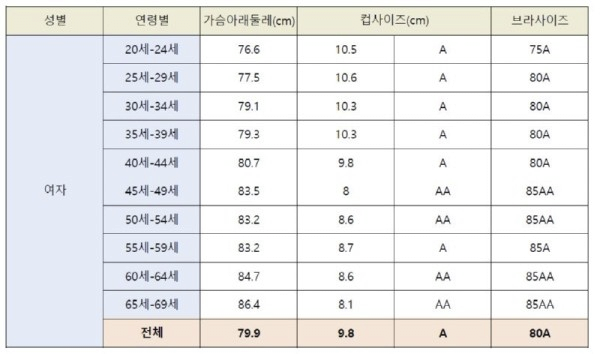 이 정보들을 취합한 대한민국 여성 평균 브라사이즈는 아래와 같다.