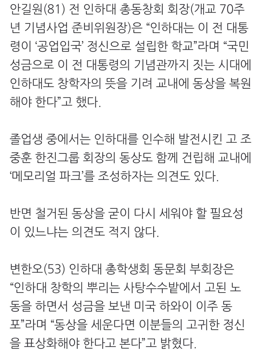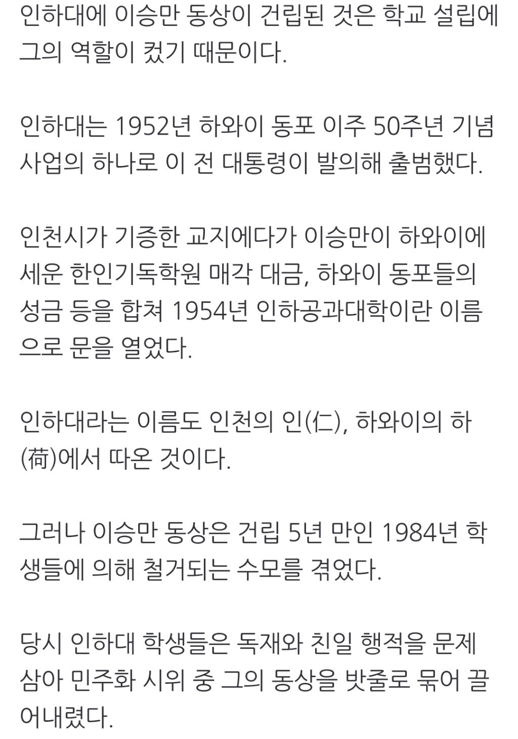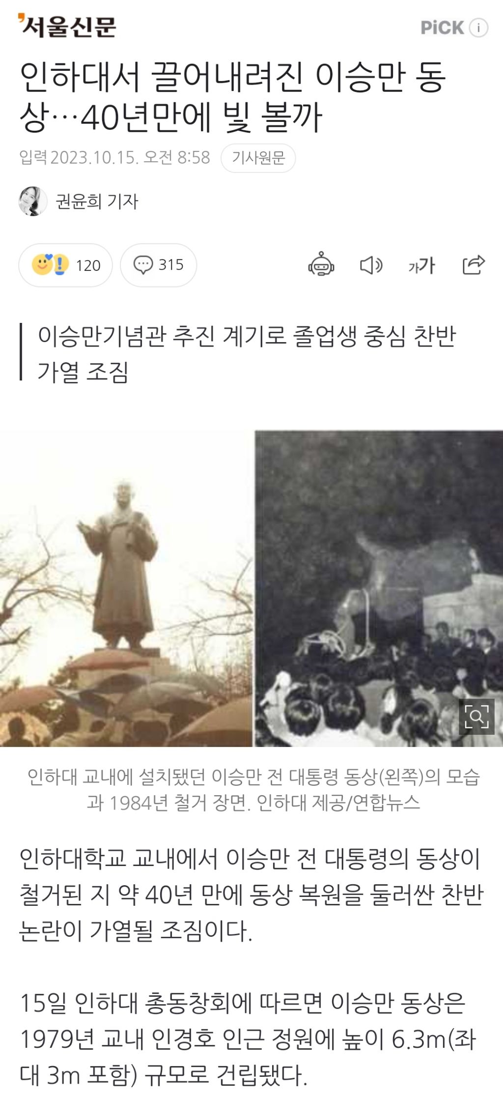 [여시뉴스데스크]인하대서 끌어내려진 이승만 동상…40년만에 빛 볼까 작성자천리길|작성시간23.10.29|조회수3,611 목록 댓글 12 글자크기 작게가 글자크기 크게가 출처 : https://naver.me/GLSBqrEE인하대서 끌어내려진 이승만 동상…40년만에 빛 볼까인하대학교 교내에서 이승만 전 대통령의 동상이 철거된 지 약 40년 만에 동상 복원을 둘러싼 찬반 논란이 가열될 조짐이다. 15일 인하대 총동창회에 따르면 이승만 동상은 1979년 교내 인경호 인n.news.naver.com중략이하 생략전문 출처로 다음검색 현재 게시글 추가 기능 열기 북마크 공유하기 신고 센터로 신고 댓글 댓글 12 댓글쓰기 답글쓰기 댓글 리스트 답댓글 작성자멜라토닌흡수중 | 작성시간 23.10.29 22 나도 졸업생인데 인하대남 다 일베 ㅇㅈ 개쪽팔림 진짜 답댓글 작성자웅치킨룽치킨 | 작성시간 23.10.30 33 ㅅㅂ 졸업생으로서 인하대남 최악입니다 으 작성자말벅지 | 작성시간 23.10.29 대가리부터 메다꽂아 세워 작성자아아즈세여 | 작성시간 23.10.29 ㅅㅂ먼 개짓거리여 졸업생투표해 작성자롤리풉 | 작성시간 23.10.29 뭔 댓글 전체보기