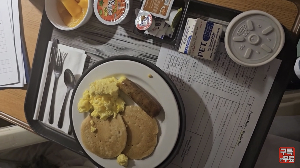 커피, 우유, 통조림 과일, 팬케이크, 계란, 소시지