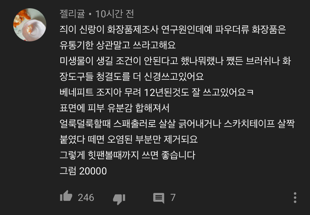 [스크랩] [흥미돋]가루 타입 화장품은 유통기한 안 지켜도 됨❓❓ㅇㅇ 됨.jpg 작성자링링링고|작성시간23.10.29|조회수10,803 목록 댓글 60 글자크기 작게가 글자크기 크게가 출처 : 여성시대 살라자르 슬리데린https://youtu.be/NdyKCZ7ZfBw 다음검색 스크랩 원문 : *여성시대* 차분한 20대들의 알흠다운 공간 현재 게시글 추가 기능 열기 북마크 공유하기 신고 센터로 신고 댓글 댓글 60 댓글쓰기 답글쓰기 댓글 리스트 작성자정타이완 | 작성시간 23.10.29 껍데기 너덜너덜해진 베네피트 블러셔 10년째 걍 쓰는중ㅋㅋㅋ 삭제된 댓글입니다. 답댓글 작성자물로돌을뚫듯이 | 작성시간 23.10.30 허얼 줏어와 ㅠㅠㅠㅠ 답댓글 작성자치랭스 | 작성시간 23.10.30 주서와여.,, 작성자야야이리와봐 | 작성시간 23.10.30 근데 오래되면 가루날림 너무 심해지는것들 잇드라 그건 못쓰궛어요.. 댓글 전체보기