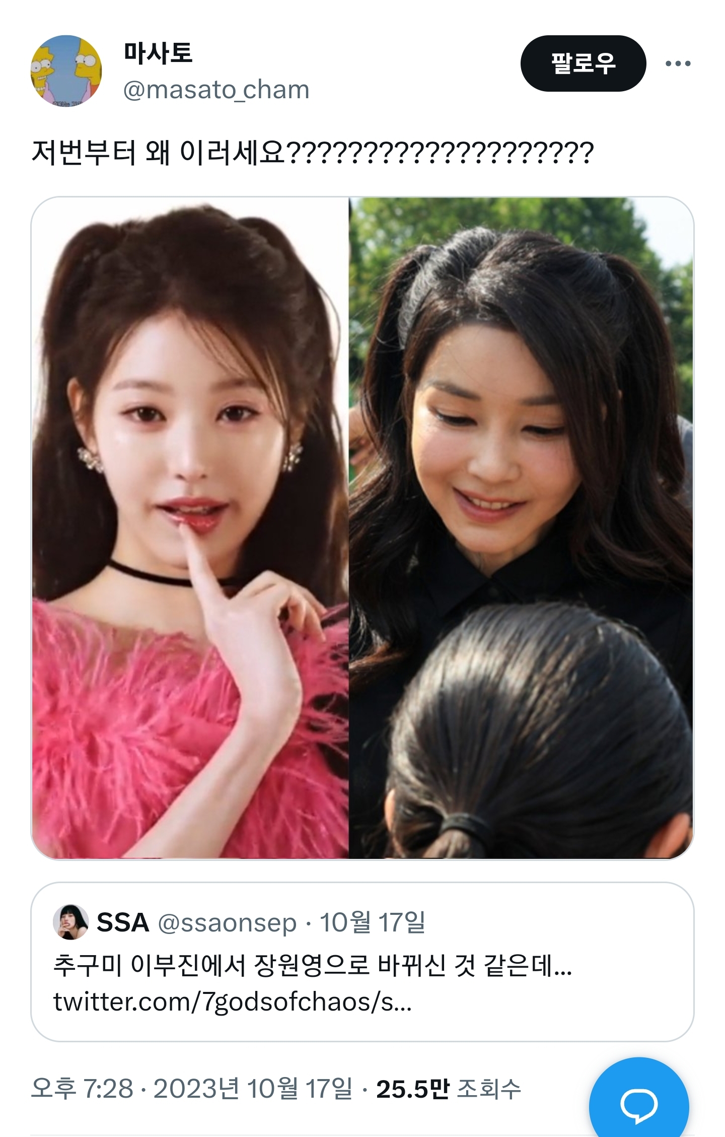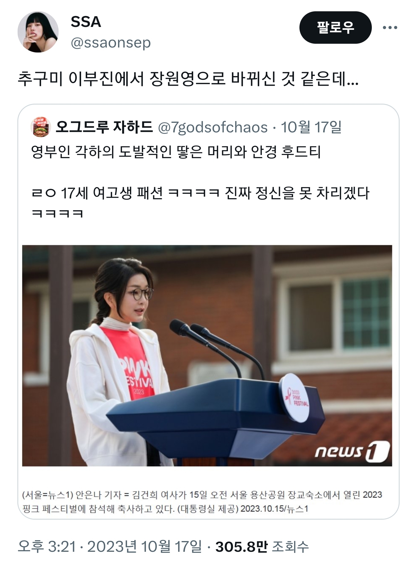 [스크랩] [흥미돋]손민수 장원영으로 바뀐듯한 김건희.jpg 작성자minimute|작성시간23.10.30|조회수94,943 목록 댓글 405 글자크기 작게가 글자크기 크게가 출처 : 여성시대 상하이스파이스버거이부진이 손민수 당해서 바꾼 스타일링이 맘에 안들었나봄 다음검색 스크랩 원문 : *여성시대* 차분한 20대들의 알흠다운 공간 현재 게시글 추가 기능 열기 북마크 공유하기 신고 센터로 신고 댓글 댓글 405 댓글쓰기 답글쓰기 댓글 리스트 작성자누뗄라 | 작성시간 23.10.31 웩 작성자반월당 | 작성시간 23.10.31 장원영 스타일.. 할 수 있지 근데 공식석상에서는 할 수 없다 작성자THE ROSE OF NO MANS LAND | 작성시간 23.11.01 할머니... 정신차려요....... 작성자닉넴닉넴니익 | 작성시간 23.11.01 ㅋㅋㅋㅋㅋㅋㅋㅋㅋㅋㅋㅋ 작성자막눈광 | 작성시간 23.12.02 제발,,, 댓글 전체보기
