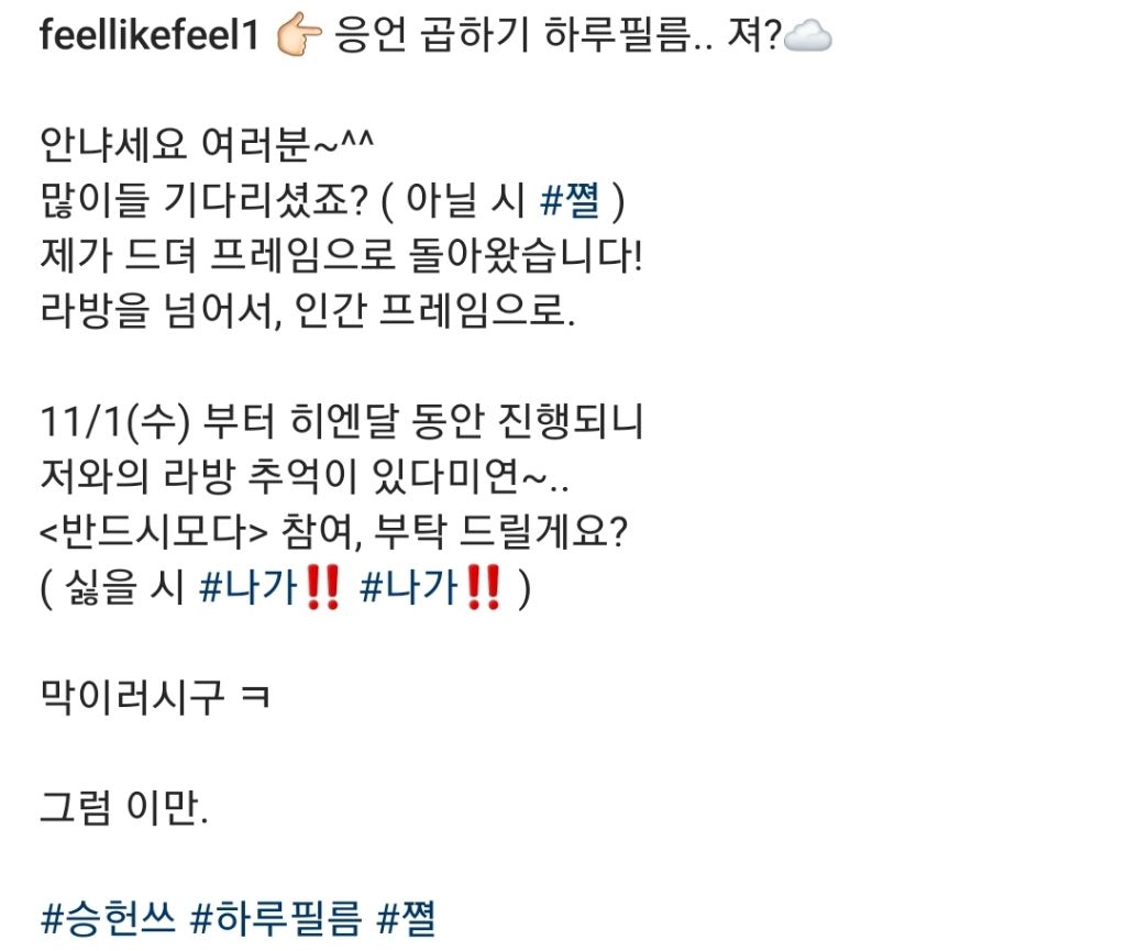 [흥미돋]11월 히엔달 동안 하루필름 주인공 되는 승헌쓰 작성자단지 널 사랑해|작성시간23.10.30|조회수9,303 목록 댓글 21 글자크기 작게가 글자크기 크게가 출처 : 여성시대 단지 널 사랑해슨배림;; 혼자 너무 자리 차지 하시는데여;;에 대한 승헌쓰 답 다음검색 현재 게시글 추가 기능 열기 북마크 공유하기 신고 센터로 신고 댓글 댓글 21 댓글쓰기 답글쓰기 댓글 리스트 작성자일삼팔 | 작성시간 23.10.30 히엔달ㅋㅋㅋㅋㅋㅋ 작성자쫀두기 | 작성시간 23.10.30 ㅋ 히엔달ㅋㅋㅋㅋ 작성자밤빵빰 | 작성시간 23.10.30 히엔달이 한달인가? 아 웃겨 작성자멜론이젤조아 | 작성시간 23.10.31 ㅋㅋㅋㅋㅋㅋㅋㅋㅋㅋㅋㅋㅋㅋㅋㅋㅋㅋㅋㅋㅋㅋㅋㅋㅋㅋㅋㅋㅋㅋㅋㅋㅋㅋㅋㅋㅋㅋ 작성자환상경계소설 | 작성시간 23.10.31 시ㅏ바 너무웃겨 진짜 뫃뫃뫃ㅋㅋㅋㅋㅋㅋㅋㅋㅋㅋㅋㅋㅋㅋㅋㅋㅋㅋㅋㅋ큐ㅠㅠㅠㅠㅠㅠㅠㅠㅠㅠㅠㅠㅠㅠㅠ 댓글 전체보기