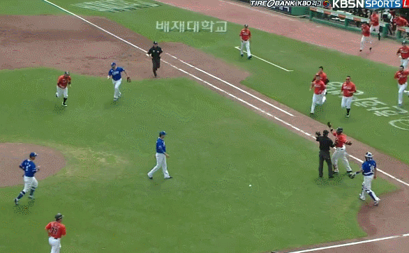 양 팀의 벤치에 있는 선수들이 난투극이 일어난 곳으로 달려가는데,