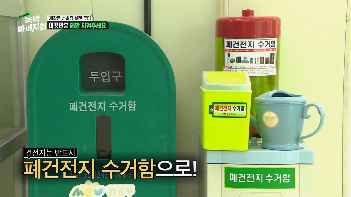 건전지 → 폐건전지 수거함(일반 쓰레기로 배출하면 폭발해서 화재 날 수 있음)