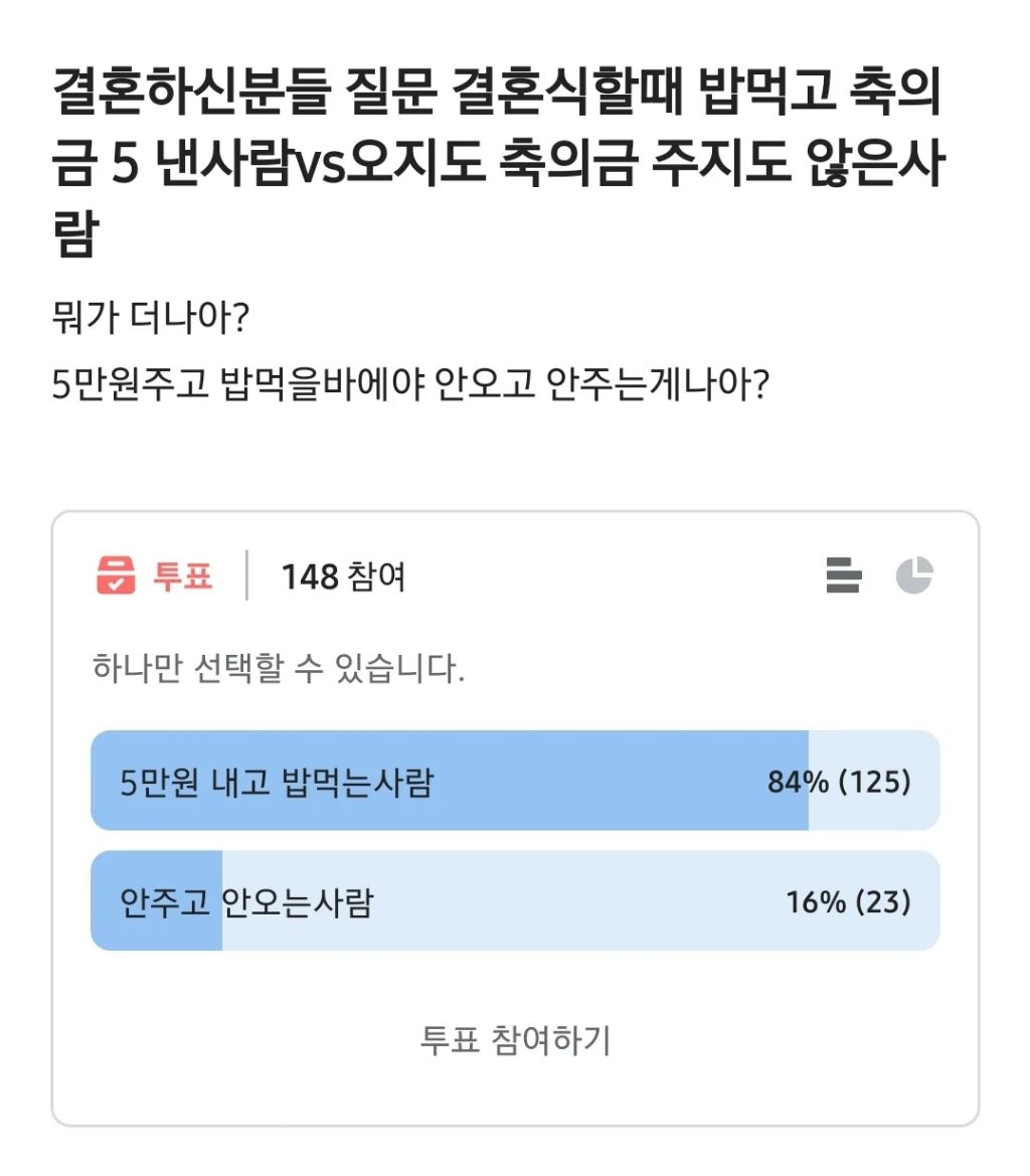 작성자빠바라밤 작성시간 23.11.06 결혼식도 허례허식문화 사라지고 가까운 지인만 초대하는 문화로 바껴야함 개나소나 다 초대하니까 낸사람은 뿌린거 걷고 싶고
