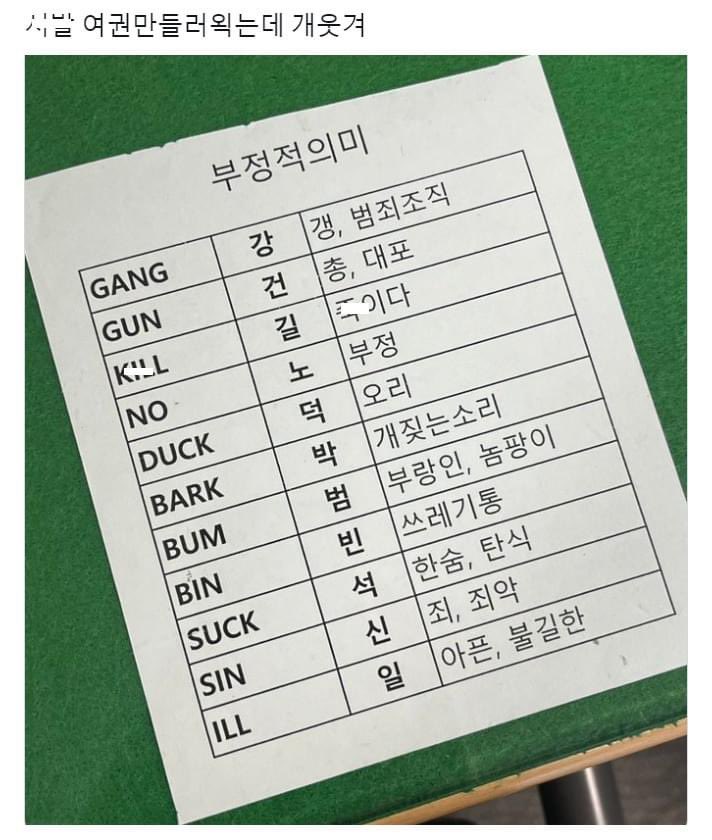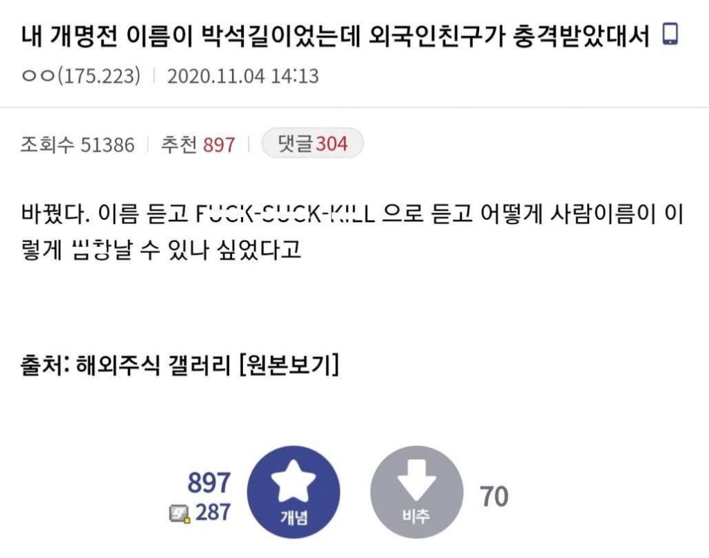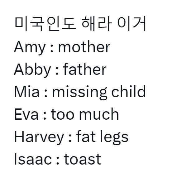 [흥미돋]외국에서 쓰면 안되는 한국이름 작성자Look up|작성시간23.11.06|조회수29,656 목록 댓글 146 글자크기 작게가 글자크기 크게가 출처 : 여성시대 Look up그리고 영어이름 다음검색 현재 게시글 추가 기능 열기 북마크 공유하기 신고 센터로 신고 댓글 댓글 146 댓글쓰기 답글쓰기 댓글 리스트 작성자일본극혐친일파극혐 | 작성시간 23.11.06 에바 하비ㅋㅋㅋㅋㅋ 작성자일루와보던가 | 작성시간 23.11.06 하비 ㅋㅋㅋㅋㅋ 작성자Amoroso | 작성시간 23.11.06 하비ㅠㅠㅠㅋㅋㅋㅋㅋ 작성자스토킹은사형감 | 작성시간 23.11.06 이샄ㅋㅋㅋ토슼ㅋㅋㅋ틐ㅋㅋㅋㅋ 작성자강인이형 | 작성시간 23.11.07 ㅁㅊㅋㅋㅋㅋㅋㅋㅋ개웃겨 ㅅㅂ 댓글 전체보기