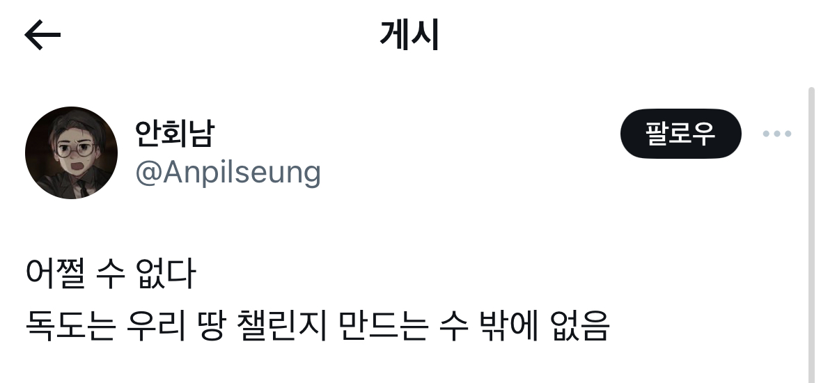 [기타]독도챌린지 시작한 네티즌 X(트위터) 계정 정지 당함.twt 작성자귤토끼이|작성시간23.11.10|조회수28,705 목록 댓글 193 글자크기 작게가 글자크기 크게가 출처 : https://theqoo.net/square/2996086610 이 글로 시작된 챌린지였음 다음검색 현재 게시글 추가 기능 열기 북마크 공유하기 신고 센터로 신고 댓글 댓글 193 댓글쓰기 답글쓰기 댓글 리스트 작성자디스코그 | 작성시간 23.11.11 엥? 작성자칷칷칷칷 | 작성시간 23.11.11 헐 미틴 작성자걸스데이 | 작성시간 23.11.11 아헐 작성자둠피캐삭해라 | 작성시간 23.11.12 헐.... 작성자牟智慧 | 작성시간 23.11.12 엥 ㅋㅋㅋ? 댓글 전체보기