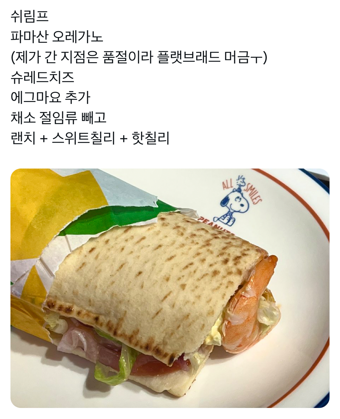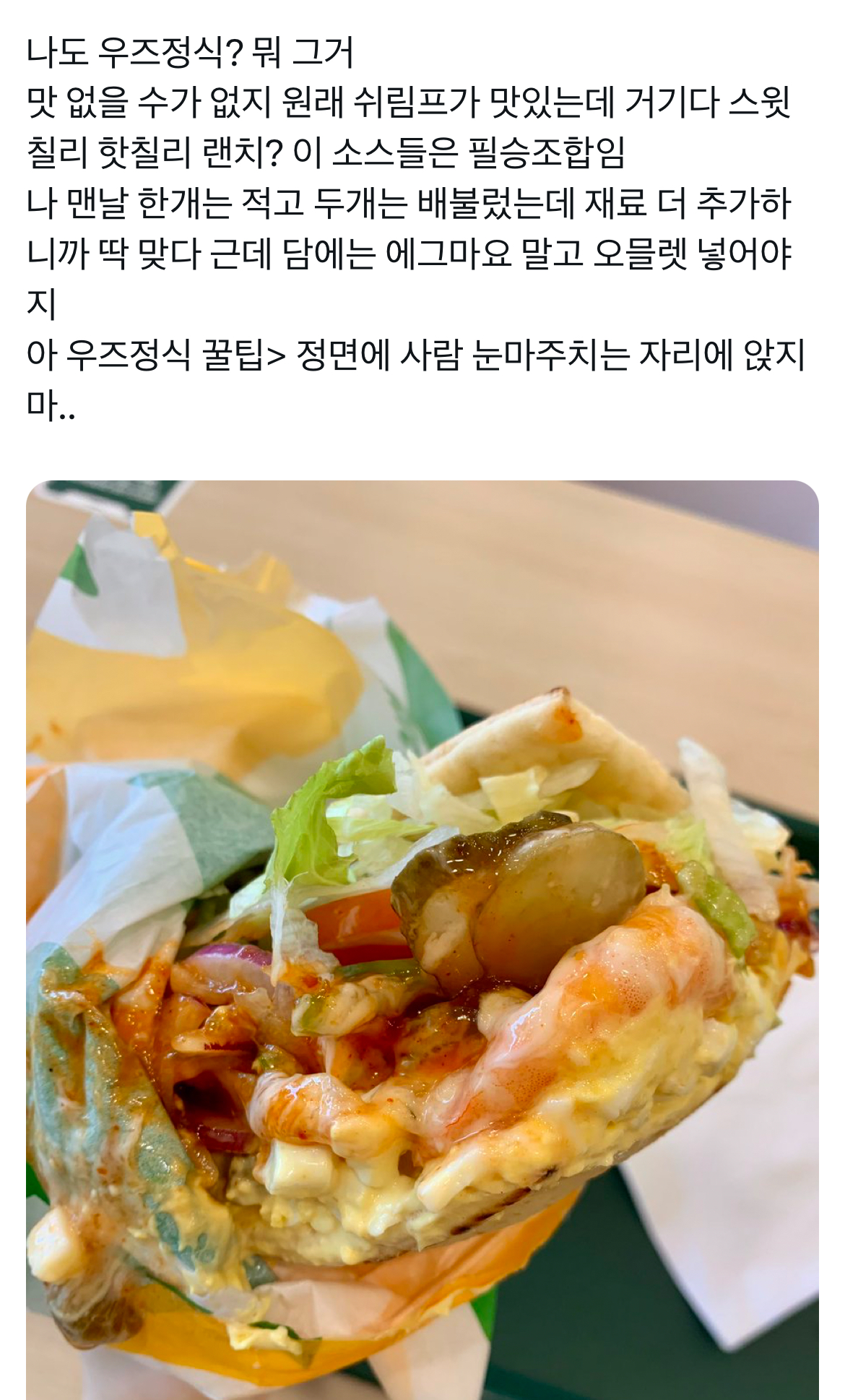 [침샘어택]요새 핫한 서브웨이 우즈정식 작성자하트 해|작성시간23.11.14|조회수162,836 목록 댓글 98 글자크기 작게가 글자크기 크게가 출처 : 하트 해가수 우즈(조승연) 팬이 만든 꿀조합 레시피라이름이 <우즈정식>맛없없 조합이긴한데 얼마나 맛있는지 나도 먹어보고싶음문제시 조승연 돼지새키본문과 관련없는 무맥락 혐오댓은 정중히 사양합니다+가격 다음검색 현재 게시글 추가 기능 열기 북마크 공유하기 신고 센터로 신고 댓글 댓글 98 댓글쓰기 답글쓰기 댓글 리스트 작성자ㅇㅇㅇㄱㅇ | 작성시간 23.11.21 근데 여시들 걍 핫칠리랑 랜치조합이 사기야 걍 베지에 그거넣어도 개맛있음 작성자암네시아아아아아 | 작성시간 23.11.22 이거먹고싶은데 시간이안나네... 작성자훈제연어베이글 | 작성시간 23.11.23 이 조합 에그마요쉬림프랩이랑 똑가터 난 그거먹어… 작성자맨덜리 | 작성시간 23.11.26 진짜맛있고 진짜비싸 작성자작고귀여워소중해 | 작성시간 23.12.22 핫칠리 넘 매워서 뺏더니 좀 슴슴햇어 재료가 많아서 소스도 넘쳐야 하나봄 댓글 전체보기