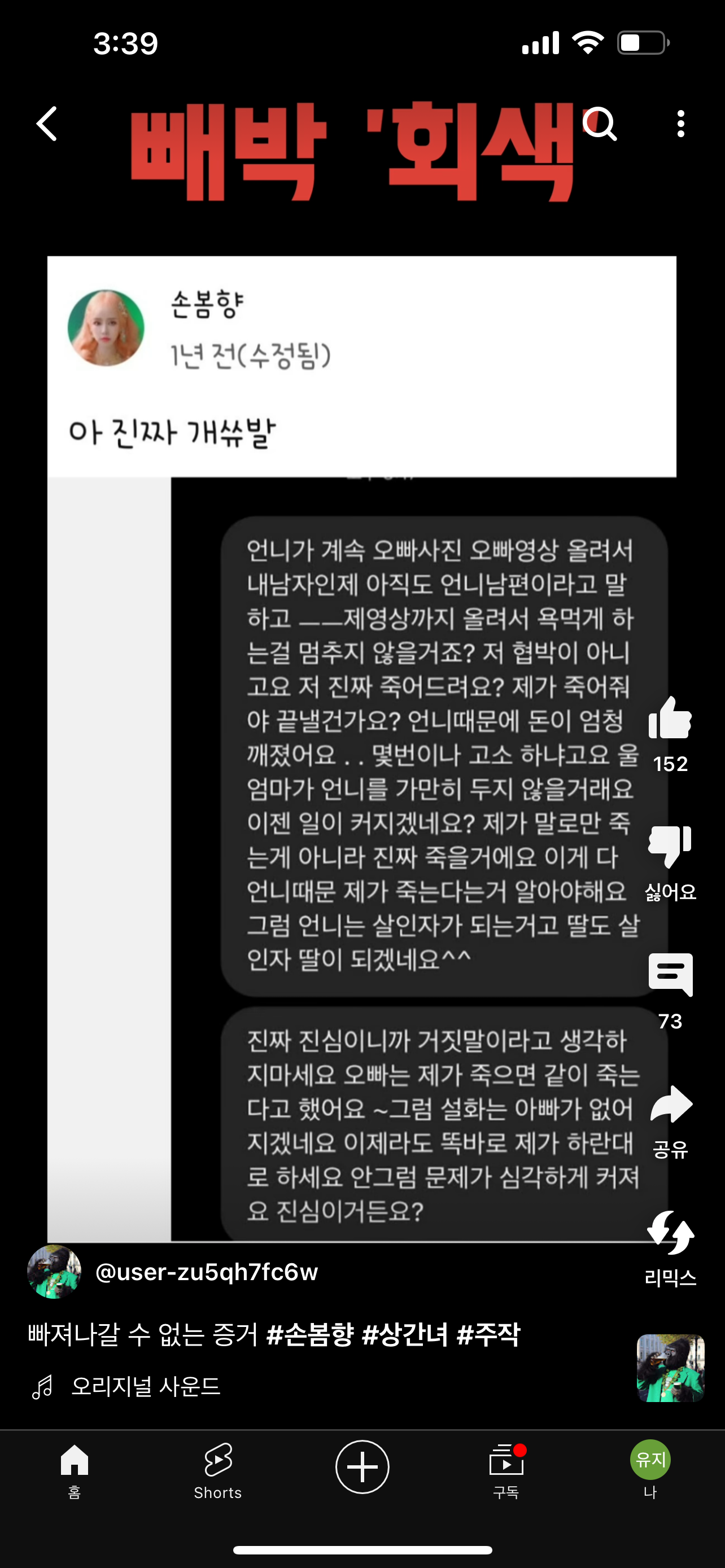 그니까 지금몇년동안 자기한테 상간녀가 보낸 디엠이라고 올라온거 전부 자기가 주작한거임..