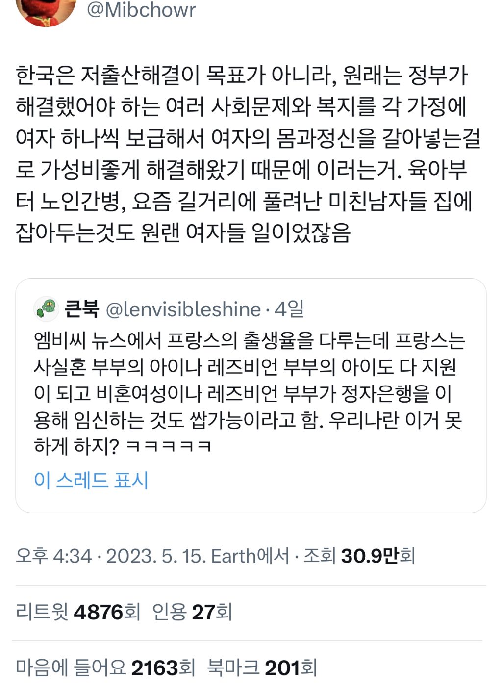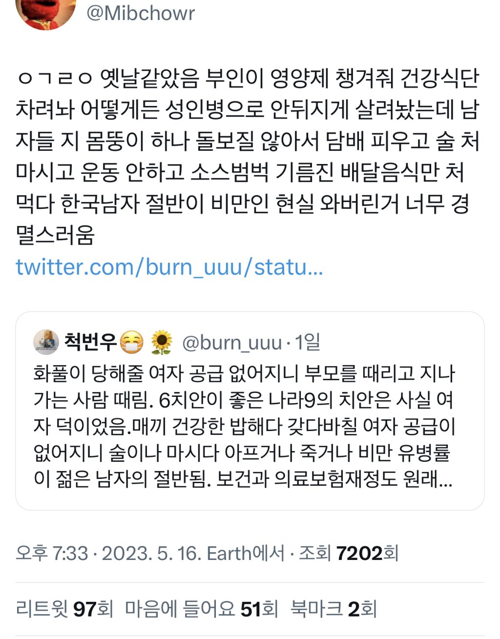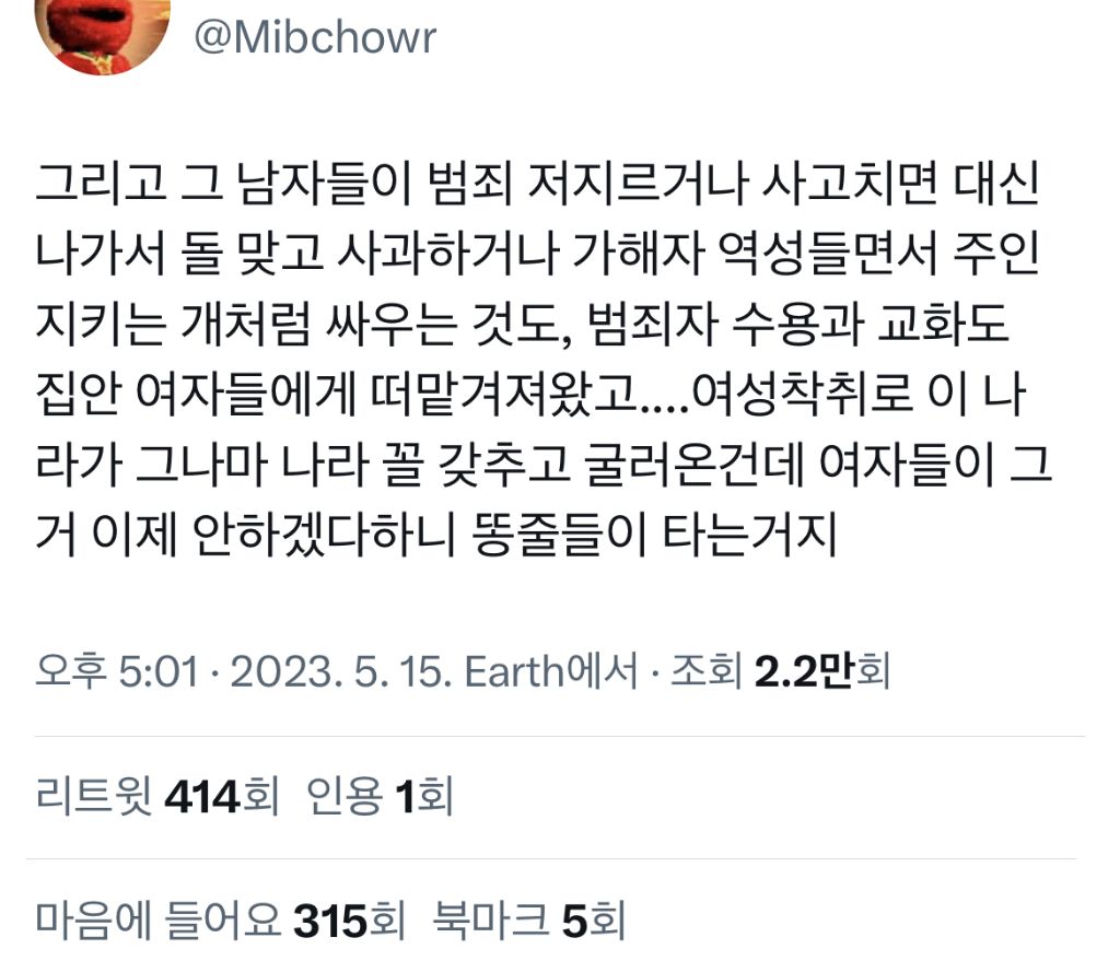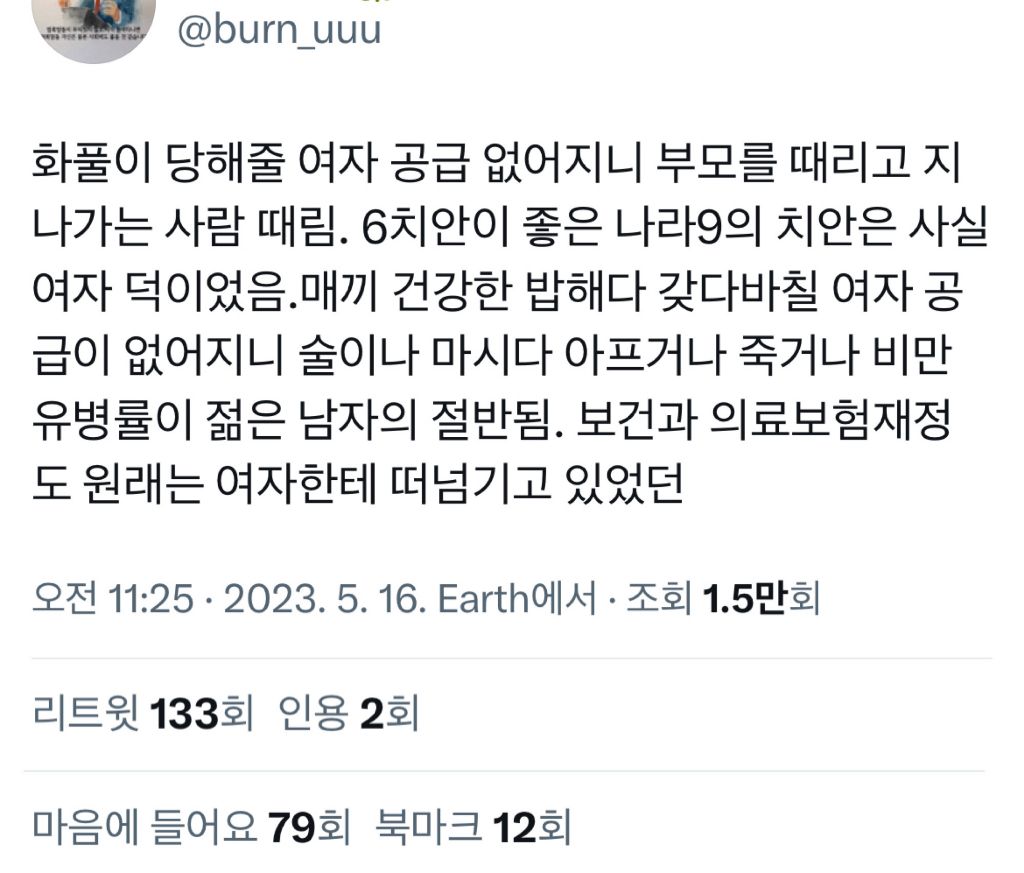작성자lifehack 작성시간 23.11.18 그동안 여자들이 1남자 1샌드백 해줬던거 ㅇㅇ 사회에서 당한 갑질 집에 오면 자기보다 서열 낮은 아내 한테 풀면 되니까 사회 나가서 다 참아지는거지 이제 자기 밑에 사람 없으면 어느날 총기난사하고 칼부림하고 걍 성향 자체가 미개해 남자들도 이거 아니까 계속 가부장제 유지하려고 하고 남존여비 사상 퍼트리고 국가 차원에서 남자 1명당 여자 1명 공급하려고 무던히 애쓴거 ㅋ 국가 혼란이 온다? 일단 여자부터 겁나 족침 여자가 오랑캐한테 몸 대줘서, 여자가 사치해서, 여자가 이기적이어서, 여자가 사랑 안해줘서... 그런식으로 남자들을 달램 남자는 많아봐야 하등 쓸모 없어