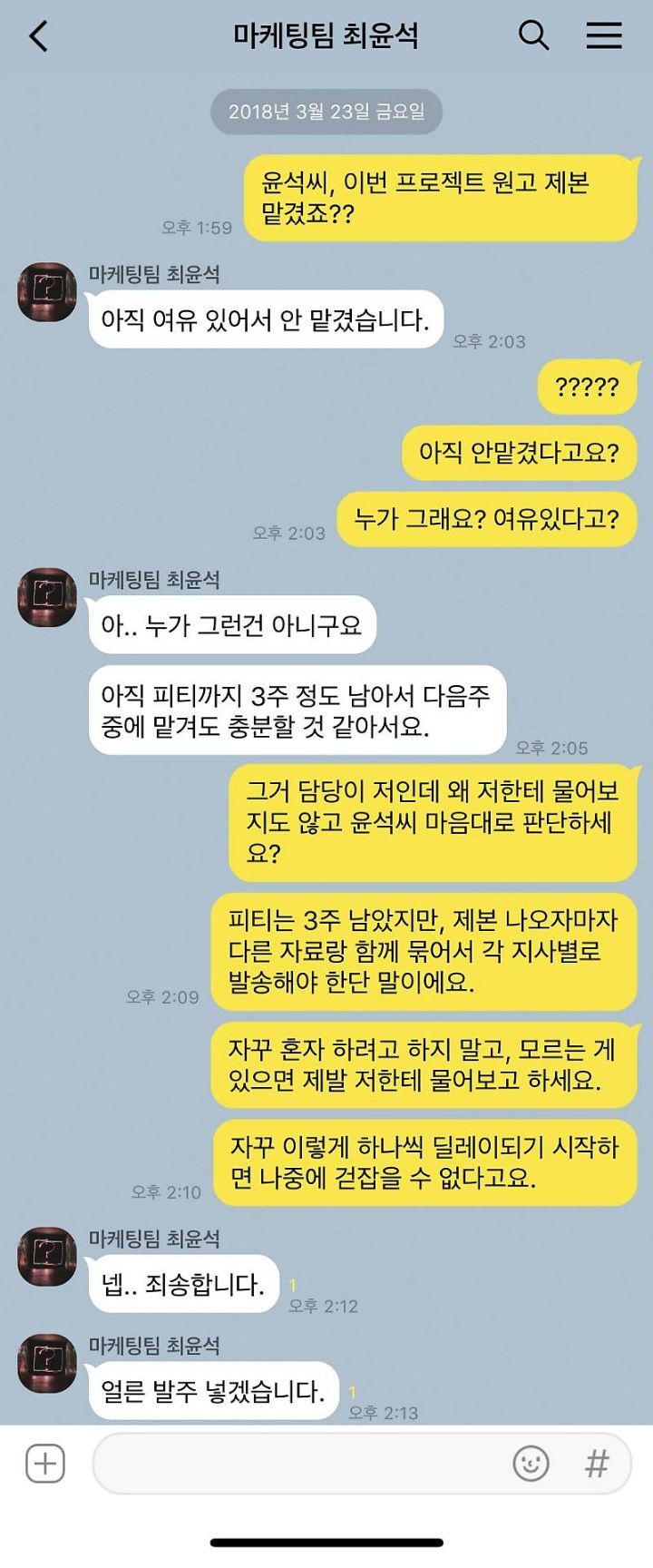 작성자송이버섯냠 작성시간 23.11.18 근데 3은 자기가 언제까지 해달라고 기한을 말해줬어야 되는 거 아니야? 아님 처음부터 일 순서가 이렇다고 가르쳐주든지ㅋㅋ 윤석이도 답답한데 본인도 제대로 얘기를 안했네
