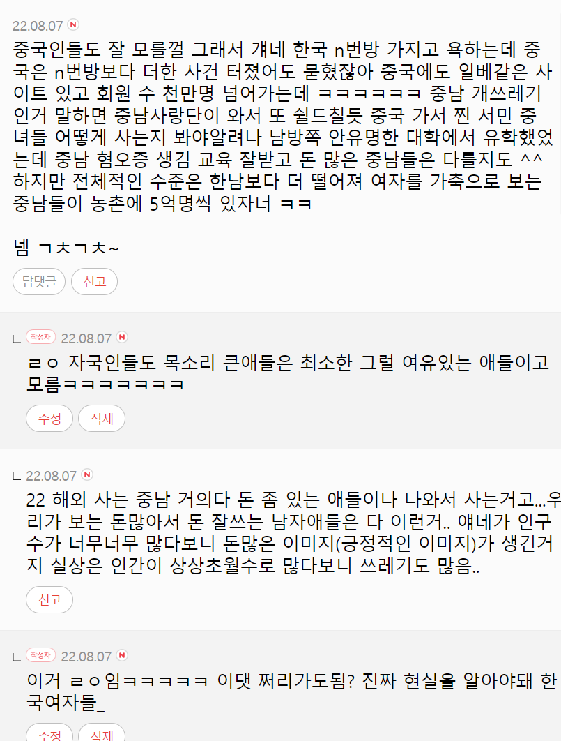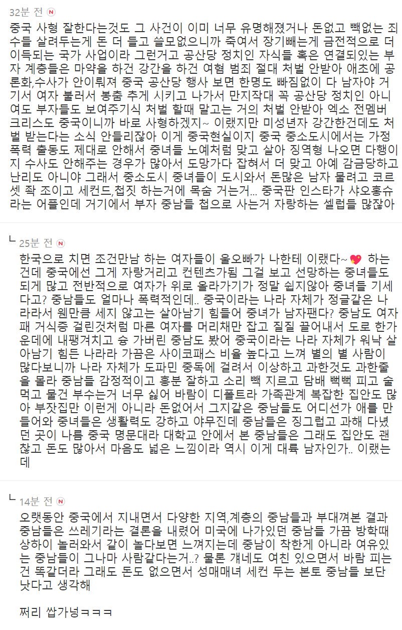아 중국인들 조차도 목소리 큰 애들은 최소한 먹고사는데 지장 없어서 지들 나라에서 먼일있는지 모름ㅋㅋㅋ그런애들 말 듣고 중국보다 한국이 심하네 하는거 100퍼센트 오류임 아예 독재국 중산층이상 하는 애들 말 듣고 나라를 어떻게판단해 ㅋㅋㅋ