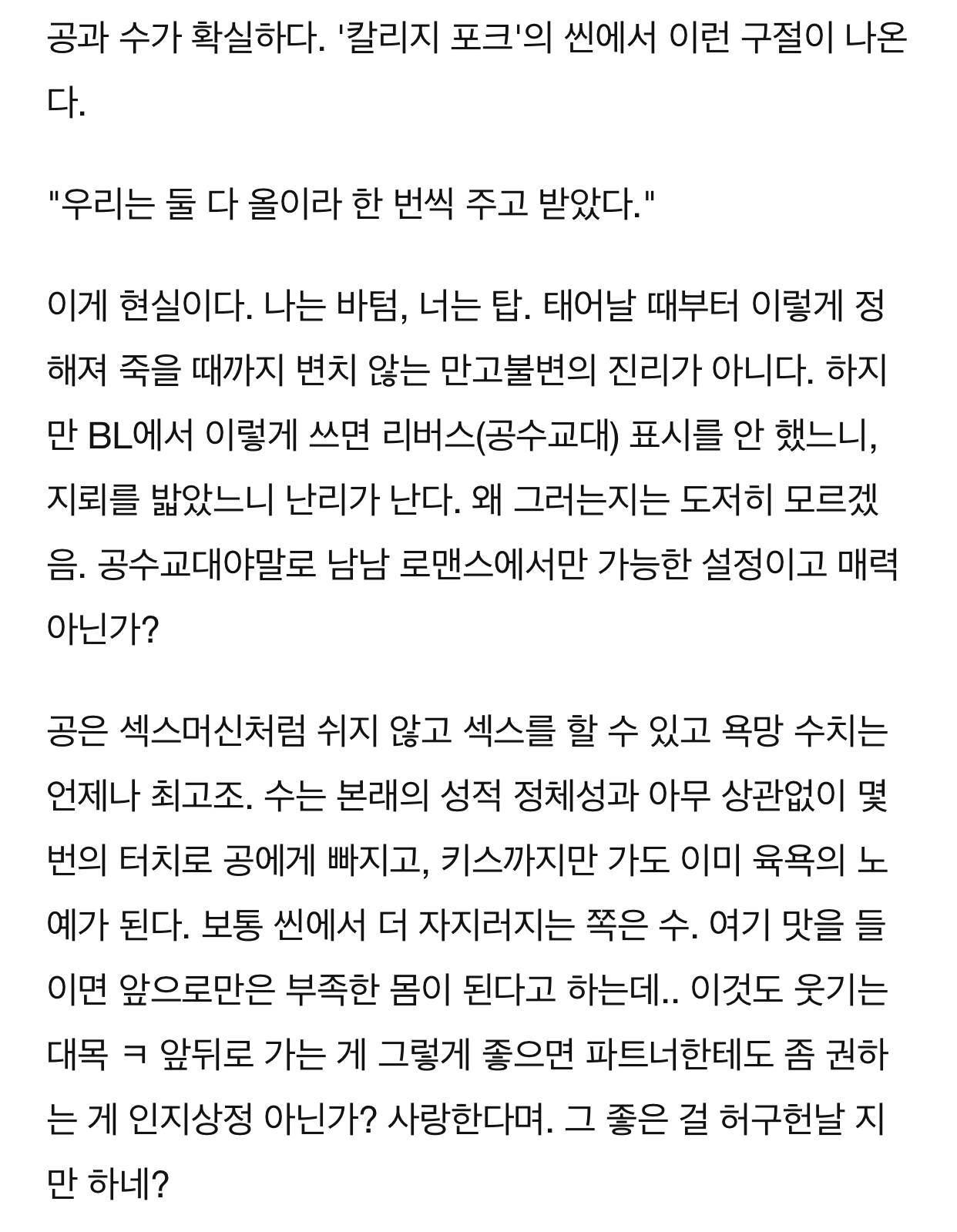 -> 헤테로 여성의 판타지 + '공/수' 역할이 정해져 있음