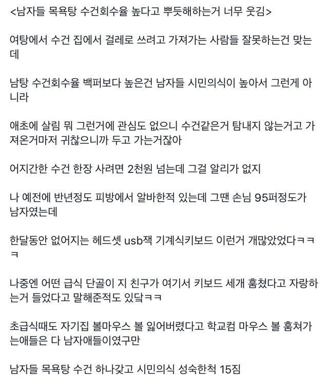 작성자챔이슬 작성시간 23.11.19 목욕탕 수건 도난율 낮다고 세상 고고한 시민인 척하는게 개웃김ㅋㅋㅋㅋ 온갖 범죄 유형 범죄자 성별은 흐린 눈ㅎㅎ