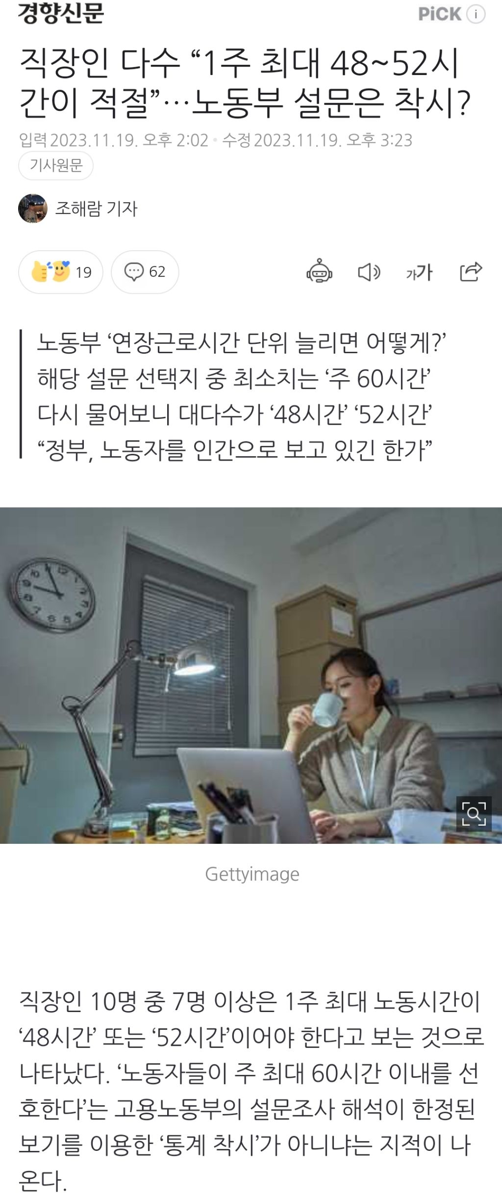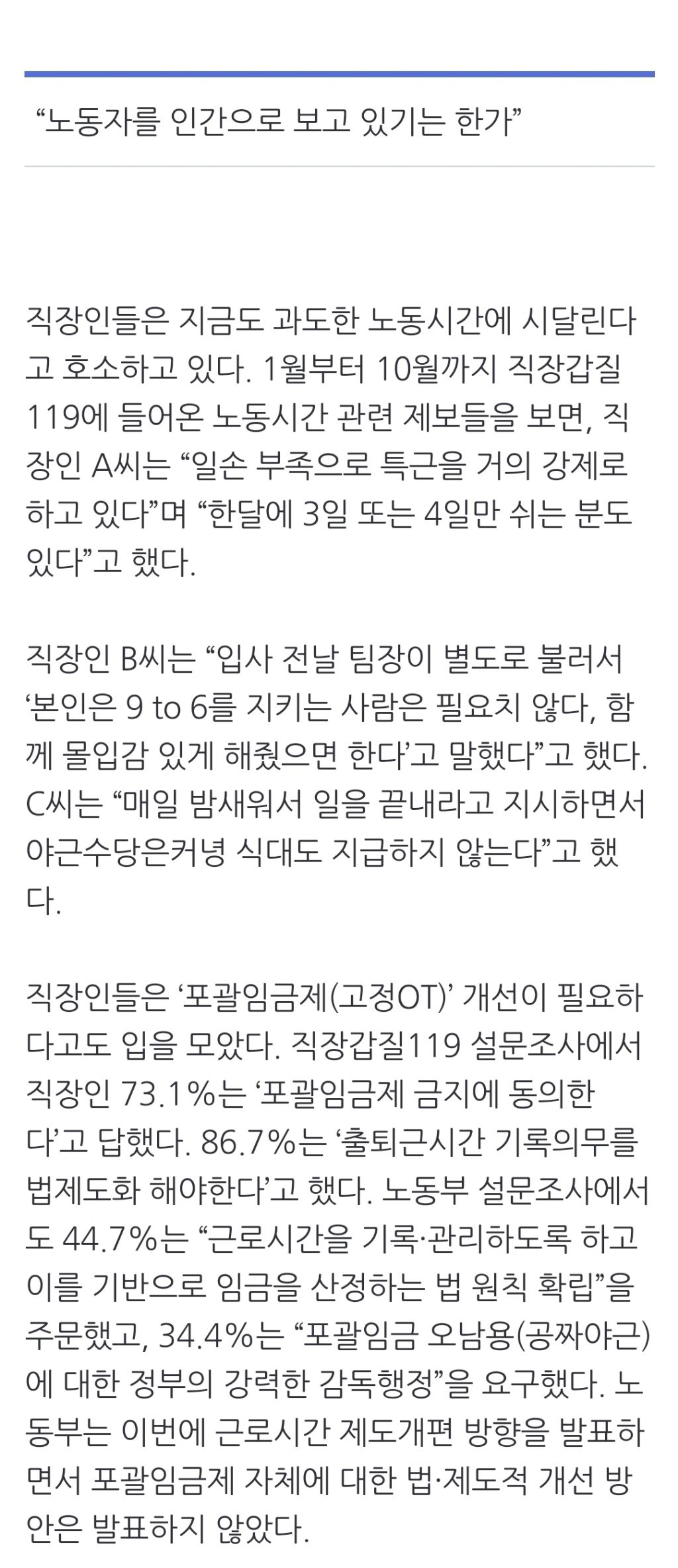 [여시뉴스데스크]직장인 다수 “1주 최대 48~52시간이 적절”…노동부 설문은 착시? 작성자천리길|작성시간23.11.19|조회수1,392 목록 댓글 21 글자크기 작게가 글자크기 크게가 출처 : https://naver.me/GwIUldPL직장인 다수 “1주 최대 48~52시간이 적절”…노동부 설문은 착시?직장인 10명 중 7명 이상은 1주 최대 노동시간이 ‘48시간’ 또는 ‘52시간’이어야 한다고 보는 것으로 나타났다. ‘노동자들이 주 최대 60시간 이내를 선호한다’는 고용노동부의 설문조사 해석n.news.naver.com중략이하 생략전문 출처로 다음검색 현재 게시글 추가 기능 열기 북마크 공유하기 신고 센터로 신고 댓글 댓글 21 댓글쓰기 답글쓰기 댓글 리스트 작성자자바칩스프링 | 작성시간 23.11.19 주35 작성자new jeans! | 작성시간 23.11.19 32시간 가자고 작성자탄야 | 작성시간 23.11.19 지랄마쇼 주 30이어도 존나 힘들듯 작성자park woo jin | 작성시간 23.11.20 개소리야 30 ㄱ 포괄없애라 작성자남또일 | 작성시간 23.11.20 10-15가 딱이다 나룰 국회로오 댓글 전체보기