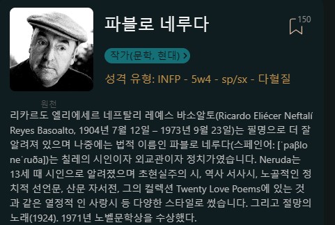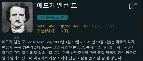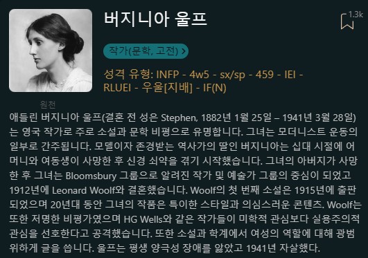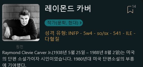 "그의 작품을 몇 권 읽은 사람이 그것을 바탕으로 그의 성격이 어땠는지 주장하는 것은 말도 안돼.우리는 그의 개인적인 삶에 대해 거의 알지 못하기 때문에 그걸 기준으로 입력 할 수는 없음.그리고 우리가 알고 있는 몇 가지 일화는 entp를 암시함. (그가 ENTP라고 제안하는 것이 아니야. 단지 몇 가지 일화를 바탕으로 기입하는 것이 왜 말이 되지 않는지 설명하는 것임)."