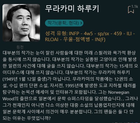 "그의 작품에는 ni와 ne가 모두 있어. 그의 작품의 주제는 의도적으로 '운명과 사물이 어떻게 될 것인지', '그들이 어떻게 시작되었는지를 고려할 때 어떻게 끝날 것인지'(Ni)와 관련이 있다." (enfj라는 의견)