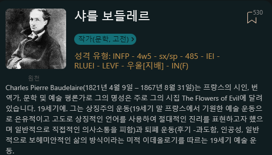 이것이 사람들이 그가 infp성향이었을 것이라고 믿는 이유임. enfp 도 가능하겠지만 그의 fi가 너무 강하다고 생각함."