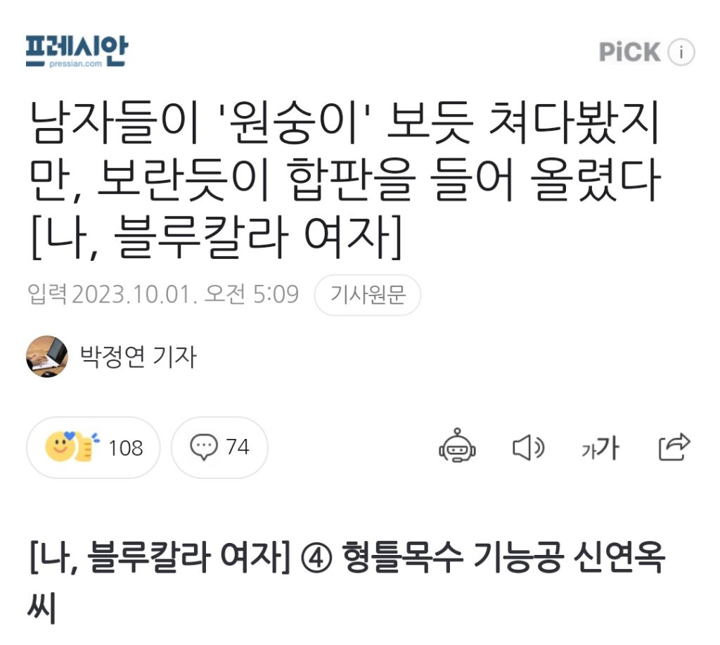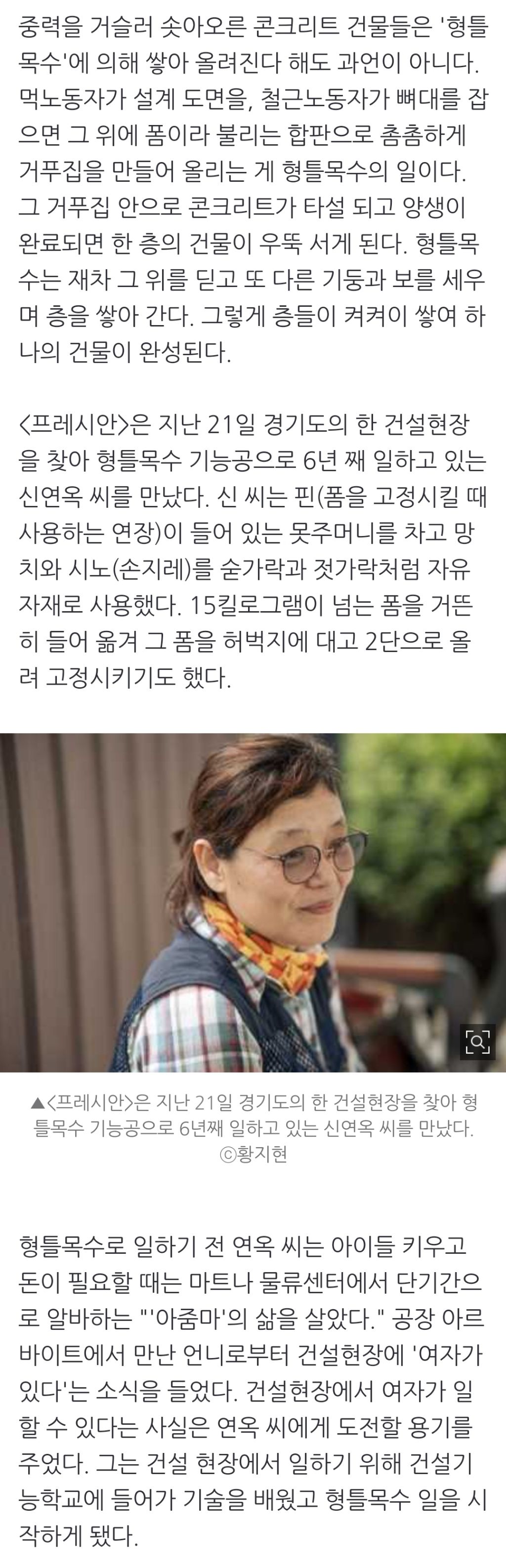 [여시뉴스데스크]남자들이 '원숭이' 보듯 쳐다봤지만, 보란듯이 합판을 들어 올렸다[나, 블루칼라 여자] 작성자천리길|작성시간23.11.19|조회수3,147 목록 댓글 2 글자크기 작게가 글자크기 크게가 출처 : https://naver.me/x6AiMCtb남자들이 '원숭이' 보듯 쳐다봤지만, 보란듯이 합판을 들어 올렸다[나, 블루칼라 여자]④ 형틀목수 기능공 신연옥 씨 '힘' 좀 써야 한다는 노동 현장, 그곳에도 여자가 있습니다. 웬만한 체력으로는 버티기 힘들다는 노동 현장에서 차별과 배제마저도 이겨낸 이들이죠. 남성 비율이 n.news.naver.com이하 생략전문 출처로 다음검색 현재 게시글 추가 기능 열기 북마크 공유하기 신고 센터로 신고 댓글 댓글 2 댓글쓰기 답글쓰기 댓글 리스트 작성자울지마,지워줄게.우리가,싸워줄게. | 작성시간 23.11.19 넘 좋아 이런 기사 보면 진짜 힘나ㅠㅠ 작성자남코노 취튀남 | 작성시간 23.11.19 고마워 좋은 기사다 댓글 전체보기