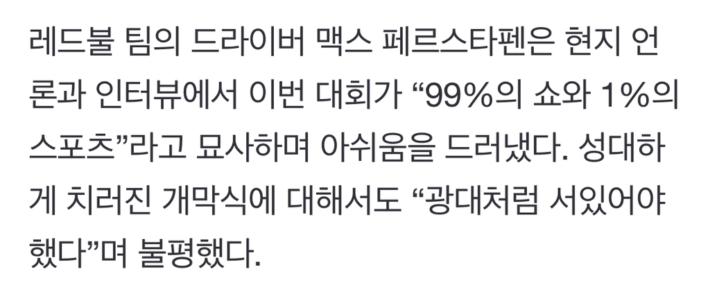 [여시뉴스데스크]F1 라스베가스 GP, 집단 소송 직면 작성자Haas F1 Team|작성시간23.11.19|조회수5,181 목록 댓글 14 글자크기 작게가 글자크기 크게가 출처 : https://n.news.naver.com/sports/general/article/410/0000968875F1 라스베가스 GP, 집단 소송 직면이번 시즌 처음 시행된 F1 라스베가스 그랑프리, 예선부터 파행이 이어지며 집단 소송에 직면했다.‘ESPN’ 등 현지 언론은 19일(한국시간) 라스베가스 그랑프리가 대규모 소송에 직면했다고 전했n.news.naver.com미방용, 오늘 레이스 하이라이트문제시 삭제 다음검색 현재 게시글 추가 기능 열기 북마크 공유하기 신고 센터로 신고 댓글 댓글 14 댓글쓰기 답글쓰기 댓글 리스트 작성자Daniel Riccardo | 작성시간 23.11.19 워매... 작성자pierre gasly | 작성시간 23.11.19 패널티 ㄹㅈㄷ 작성자강정헴 | 작성시간 23.11.19 미친 보다가 껐는데 이런일이…진짜 그팀이였어봐.. 작성자토토울프 | 작성시간 23.11.19 내가 피아, 개드불때매 2년전부터 안봄 ㅅㅂ 내 닉값 돌려줘 작성자부가세 | 작성시간 23.11.19 미친거아니야??? 작년인가 재작년부터 라스베가스 한다거 꼴값떨때부터 알아봄 미국 그랑프리 늘어나는거 싫어.. 댓글 전체보기