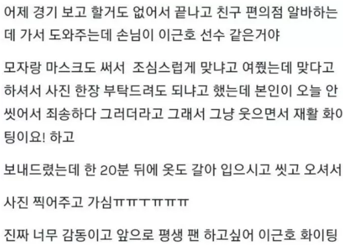 [흥미돋]팬의 사진요청 거절한 어느 축구선수.jpg 작성자nvmc|작성시간23.11.19|조회수16,632 목록 댓글 25 글자크기 작게가 글자크기 크게가 출처 : 여성시대 nvmc 그때 같이 찍은 사진이근호(1996) 다음검색 현재 게시글 추가 기능 열기 북마크 공유하기 신고 센터로 신고 댓글 댓글 25 댓글쓰기 답글쓰기 댓글 리스트 답댓글 작성자팰리셰이드 | 작성시간 23.11.19 222깜짝놀랫샄ㅋㅋㅋ켘ㅋ 답댓글 작성자헤드위그 | 작성시간 23.11.19 333다른 이근혼줄ㅋㅋㅋㅋㅋㅋㅋㅋㅋㅋㅋㅋ 답댓글 작성자장희원 | 작성시간 23.11.19 홍해인 동명이인 축선 생각했나봐!!(나도 그래서) 작성자대 아니고 데 | 작성시간 23.11.19 오 팬서비스~~~ 작성자지옥의 주둥이 | 작성시간 23.11.19 착하다 댓글 전체보기