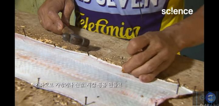 며칠 뒤 가죽이 부드러워지면 칼로 가죽을 도려냄 물론 이때도 살아있음