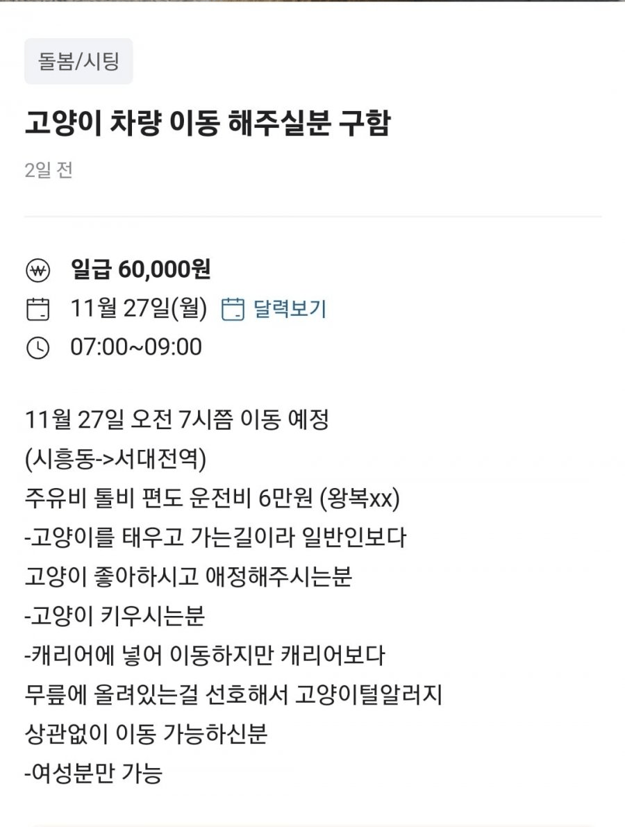 작성자오린 더 레드 작성시간 23.11.21 고양이를 꺼내서 사람 무릎에 어떻게 올리고가 진짜 바로 사고날수도있는데... 돈도 돈인데 무릎에 올리고 간다는 발상 자체가 너무 충격적임 나도 우리 애 차에 타면 멀미랑 예민해져서 꼭 내가 만져줘야되는데 내 손만 겨우들어갈 정도로만 지퍼열고 애 절대안꺼냄 미친거아니야?