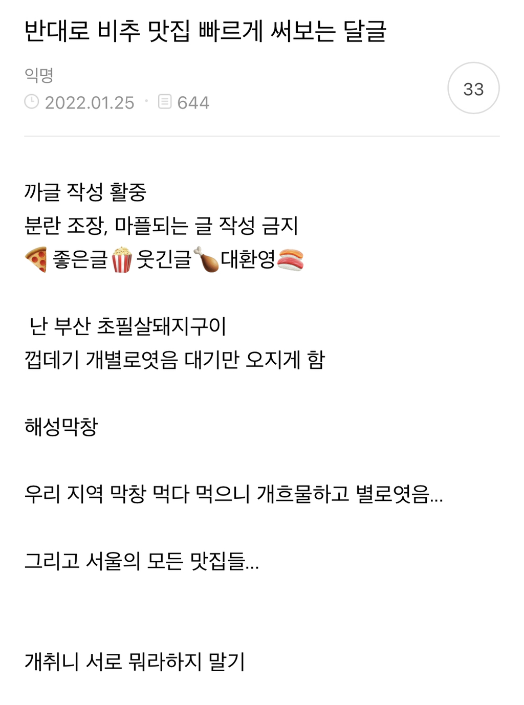 [스크랩] [흥미돋]별로였던 맛집 써보는 달글 작성자뚱뚱바|작성시간23.11.20|조회수19,057 목록 댓글 505 글자크기 작게가 글자크기 크게가 출처 : 여성시대 KUROMI추천 맛집 따라서 갔다가 실패했던 곳들 써봄ㅠ 다음검색 스크랩 원문 : *여성시대* 차분한 20대들의 알흠다운 공간 현재 게시글 추가 기능 열기 북마크 공유하기 신고 센터로 신고 댓글 댓글 505 댓글쓰기 답글쓰기 댓글 리스트 작성자웃어줄게너도 | 작성시간 23.11.21 고성생선찜 여기서 먹은 가오리찜 짜기만 해고성에 있는 백촌막국수내 입맛엔 노맛신토불이떡볶이 나한테는 매워ㅜ옆에 순금이 떡볶이는 매워도 맛있음 작성자아웃나우 | 작성시간 23.11.21 쥬에.. 난 딤딤섬이 훨 맛있음 작성자핡몀수 | 작성시간 23.12.02 송계옥 작성자Lucky Daye | 작성시간 23.12.30 경주 신라제면 대구 칸다소바 서울 대부분의 식당.. 작성자미묘미묘2 | 작성시간 24.11.09 성수 꿉당서울숲 난포 댓글 전체보기