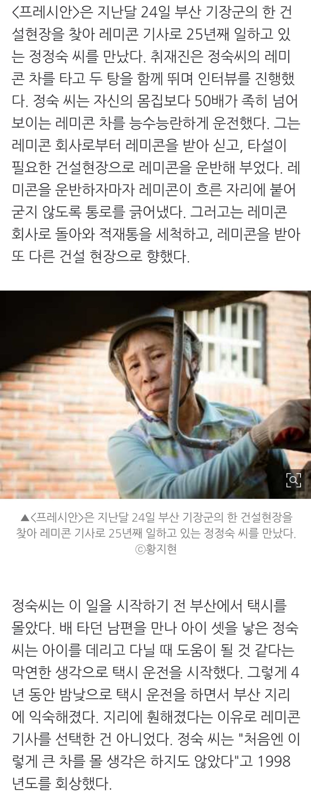 [여시뉴스데스크]레미콘 차를 여자가 몬다고? "하면 어떤데요"[나, 블루칼라 여자] 작성자천리길|작성시간23.11.21|조회수1,753 목록 댓글 8 글자크기 작게가 글자크기 크게가 출처 : https://naver.me/5ipxgzYh레미콘 차를 여자가 몬다고? "하면 어떤데요"[나, 블루칼라 여자]⑥ 레미콘 운전기사 정정숙씨 '힘' 좀 써야 한다는 노동 현장, 그곳에도 여자가 있습니다. 웬만한 체력으로는 버티기 힘들다는 노동 현장에서 차별과 배제마저도 이겨낸 이들이죠. 남성 비율이 n.news.naver.com중략이하 생략전문 출처로 다음검색 현재 게시글 추가 기능 열기 북마크 공유하기 신고 센터로 신고 댓글 댓글 8 댓글쓰기 답글쓰기 댓글 리스트 답댓글 작성자바다눈 | 작성시간 23.11.21 전문 다 읽고 공감누르기 완,, 이 부분 너무 멋있었어 이미지 확대 답댓글 작성자바다눈 | 작성시간 23.11.21 바다눈 그 성별 재기했으면.. 이미지 확대 답댓글 작성자바다눈 | 작성시간 23.11.21 바다눈 남초직종에서 일하는 모든 여성들 파이팅좋은 기사 가져와줘서 고마워 글쓴여시! 이미지 확대 작성자홀로롤ㄹ롤 | 작성시간 23.11.21 덕분에 전문 읽고왈어 고마워!! 작성자3OClockThings | 작성시간 23.11.22 멋지시다 .. 댓글 전체보기